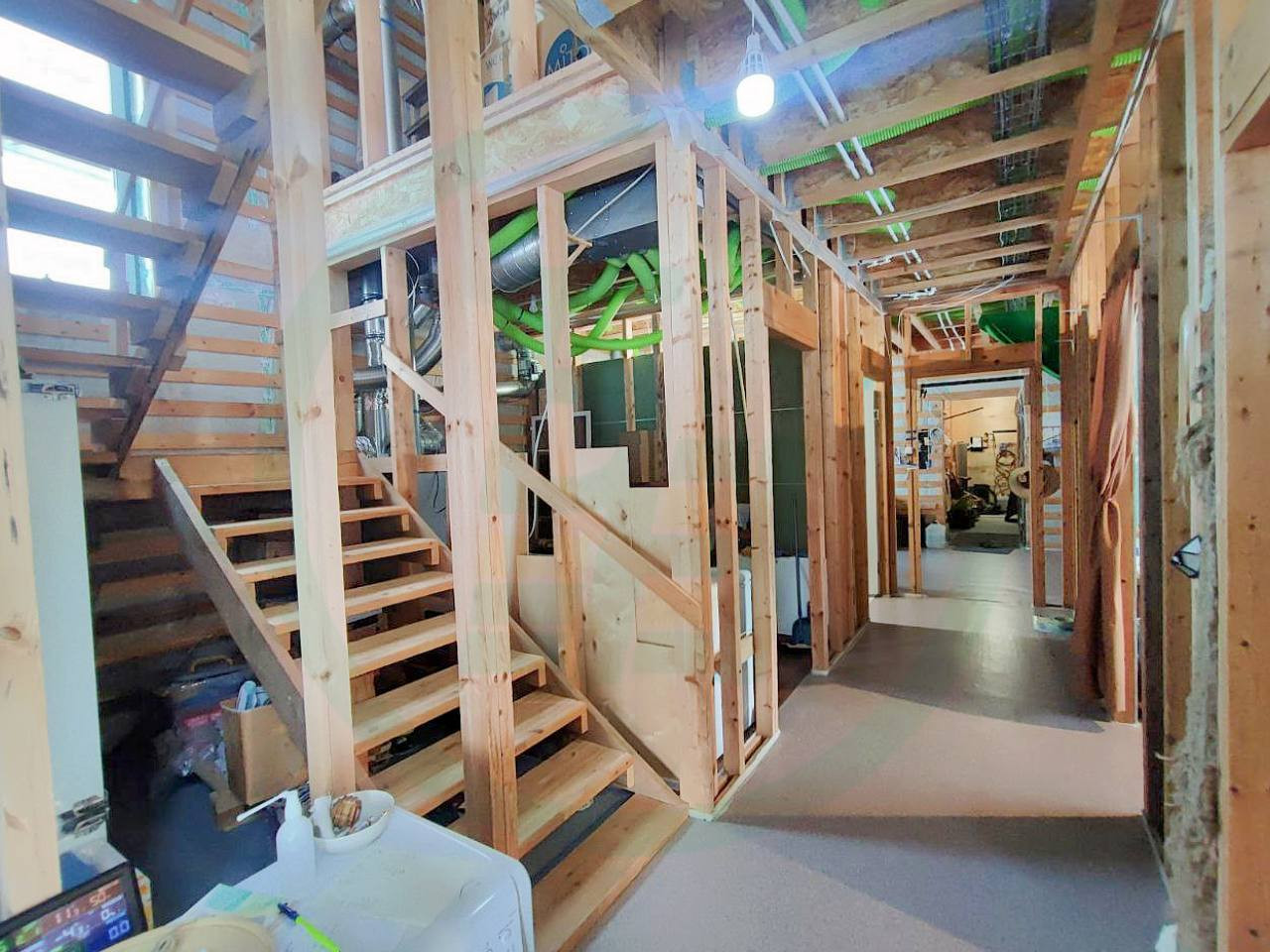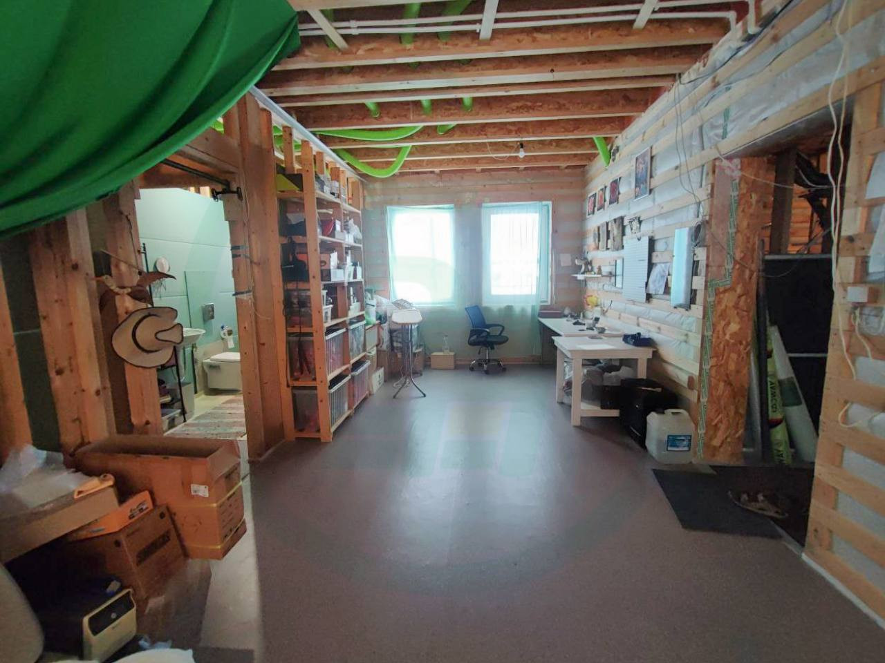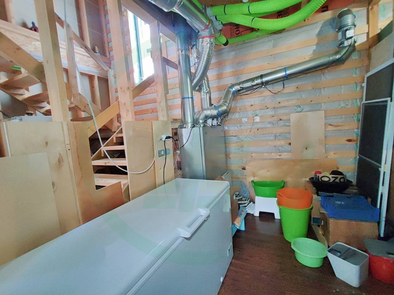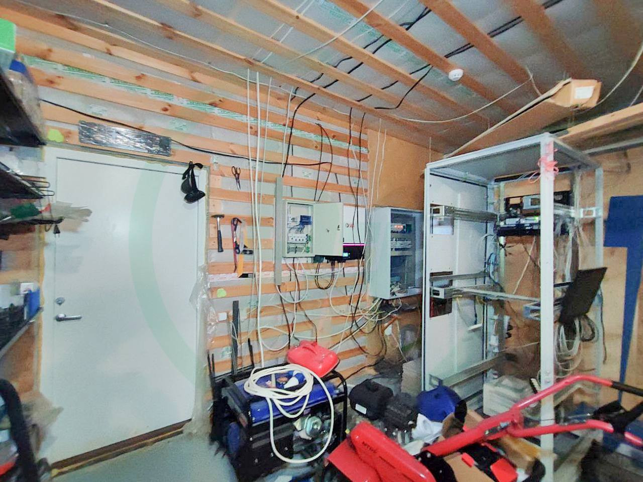 Дом построен по финской технологии «Платформа». В качестве фундаментов применены утепленные полы по грунту под основной частью дома и сваи под входными группами. Наружные и внутренние стены представляют из себя несущий деревянный каркас, заполненный задувным целлюлозным утеплителем «Эковата» и обшитый фиброцементной плитой. Толщина утепления наружних стен 300 мм!!!