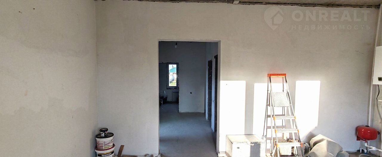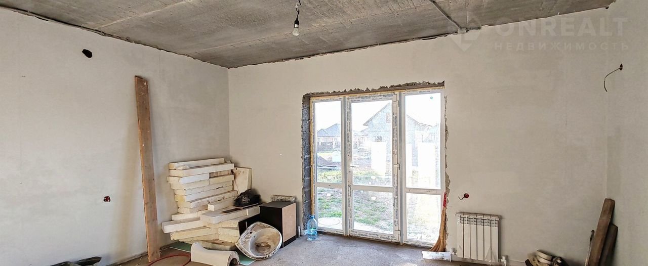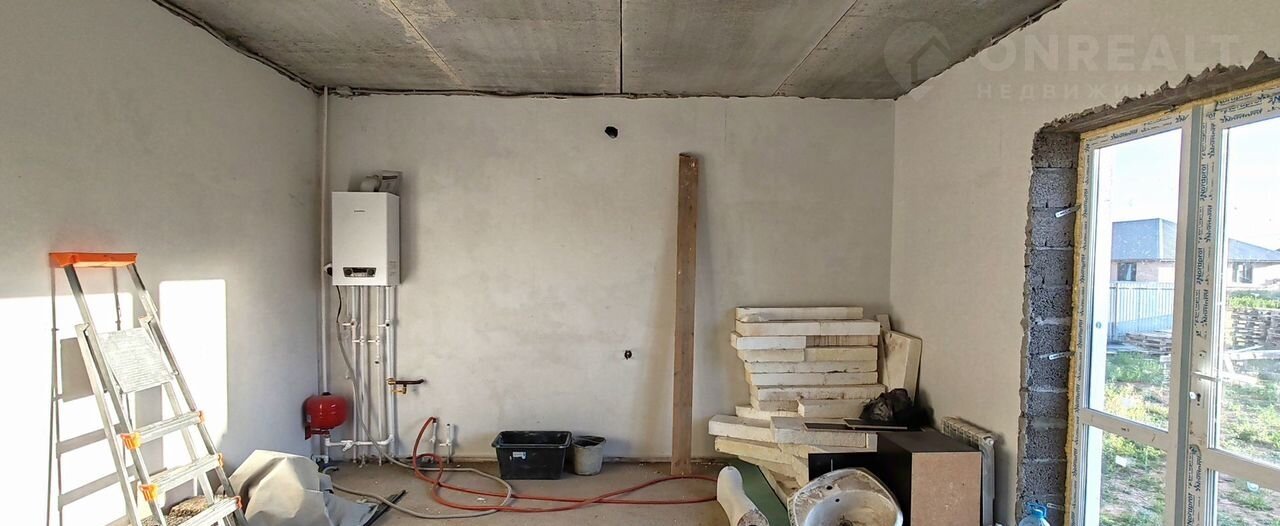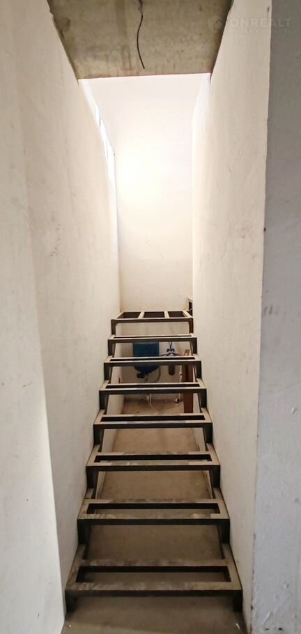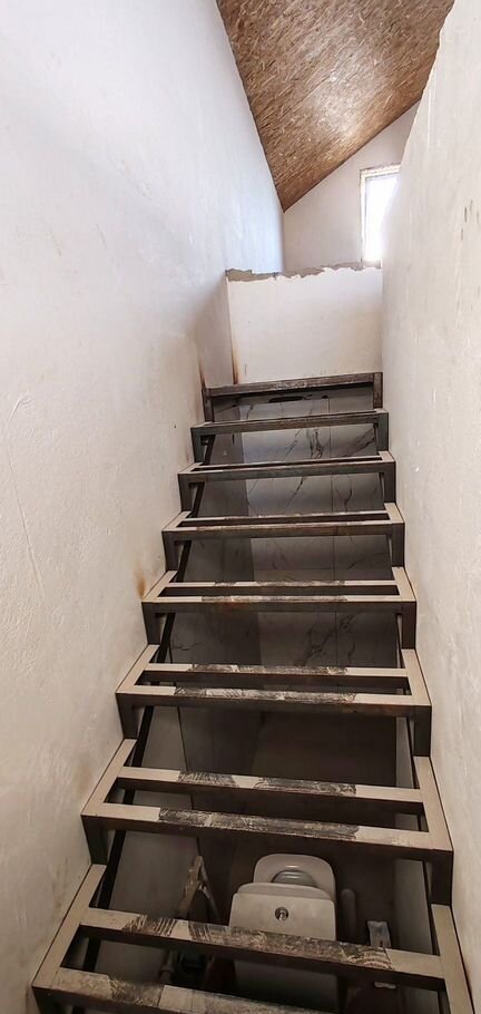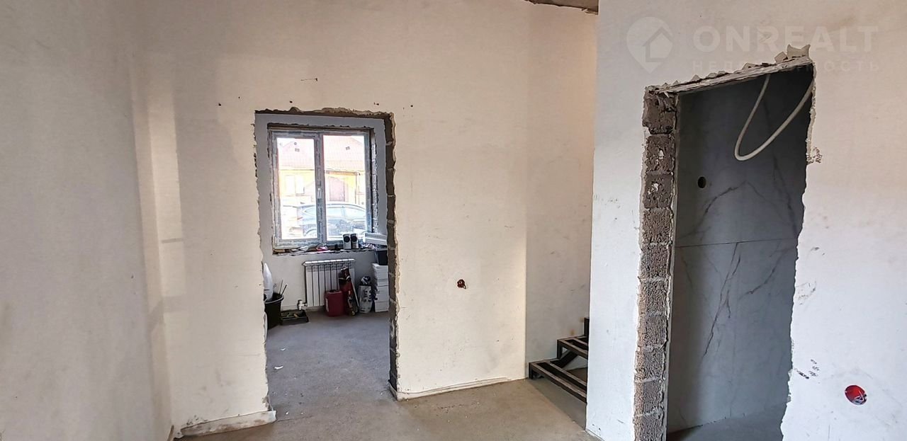 1 этаж: кухня-гостиная с выходом на заднюю часть двора, в которой все зоны функциональны и удобны, просторная спальня с двумя окнами, санузел, удобный коридор, в котором предусмотрено место под ёмкую гардеробную, крыльцо с освещением. Установлен металлический каркас лестницы на второй этаж.
