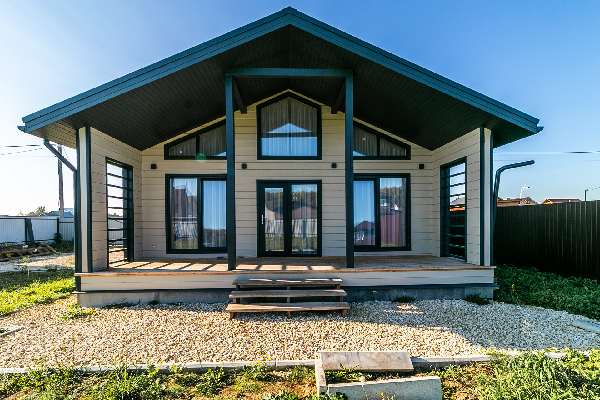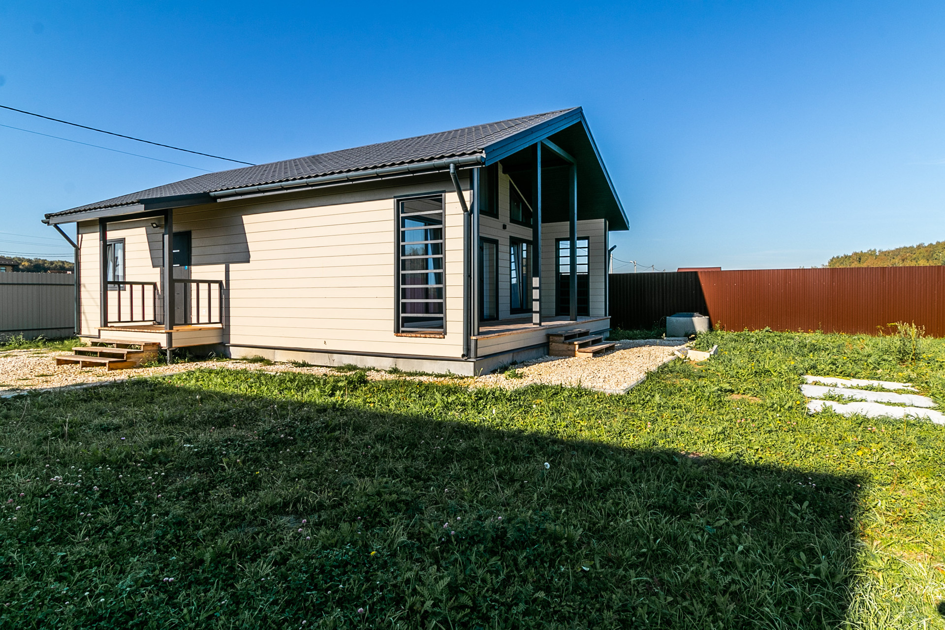 Участок ровный, этим летом установили бордюры вокруг дома и парковку для машин, засыпали все щебнем, под щебнем геотекстиль.