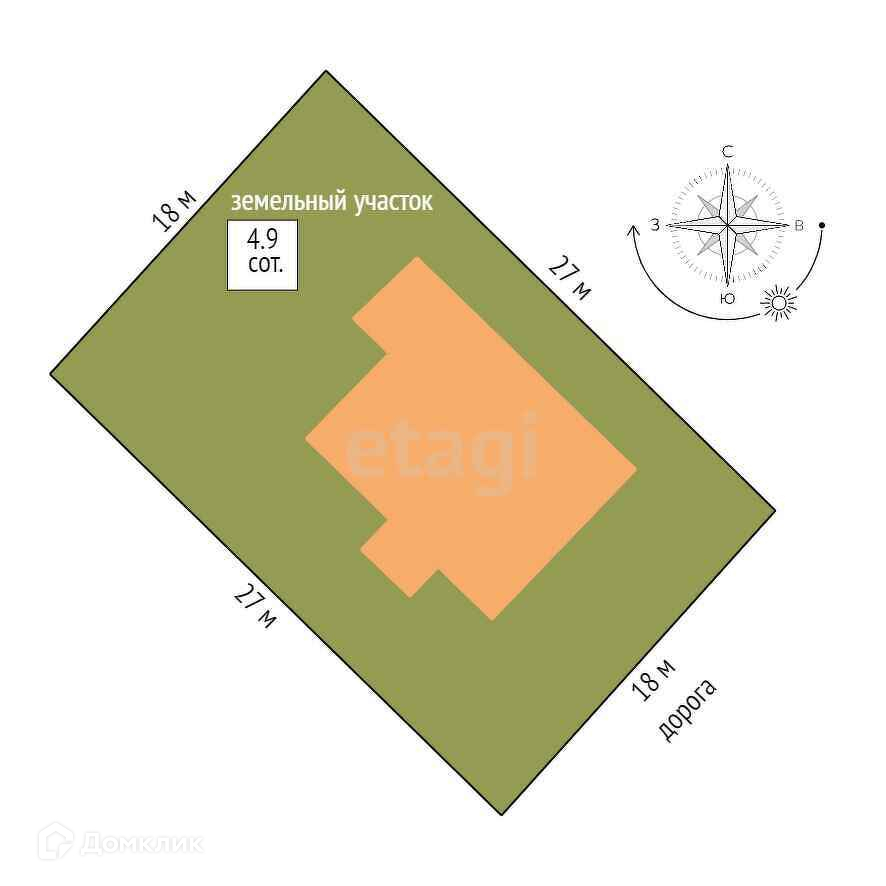 Земельный участок в 2 уровня, разработан, правильной формы, площадью 4,9 сотки. Растут плодоносящие растения и деревья: две больших черешни (белая и красная), две яблони, груша, персик, черная и дикая смородина, малина (красная и желтая), клубника.