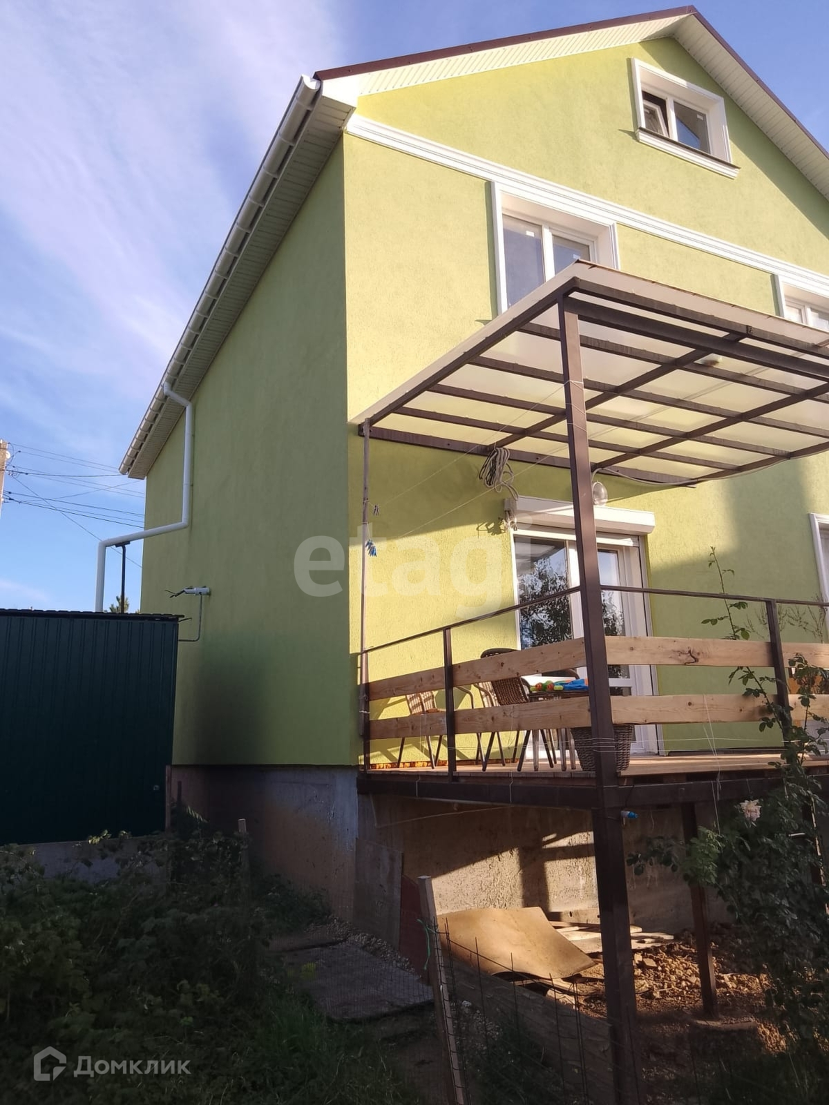 Дом построен из ракушечника, утеплен. Площадь фундамента - 80 м2, общая площадь дома - 200 м2. Первый этаж полностью готов для жизни, сделан ремонт, укомплектован техникой. Здесь располагается большая кухня-гостиная, спальня, санузел с душевой кабиной. техническое помещение, коридор. Из кухни-гостиной есть выход на террасу, которая выполнена из лиственницы. Она просторная и вместительная, размером 3х4 метра.