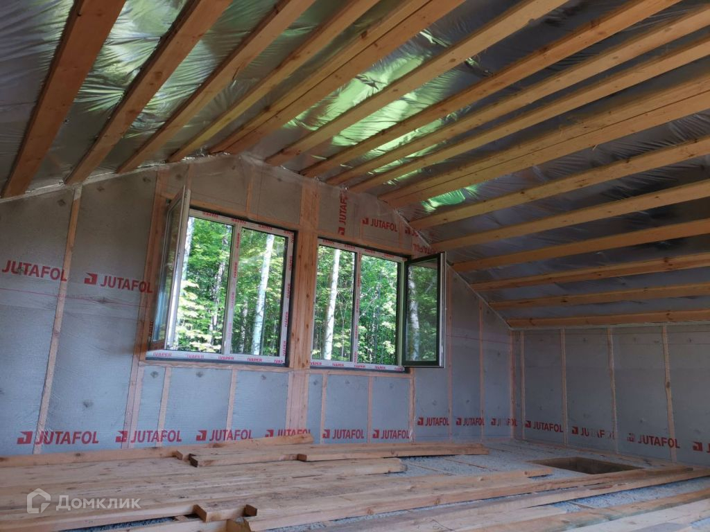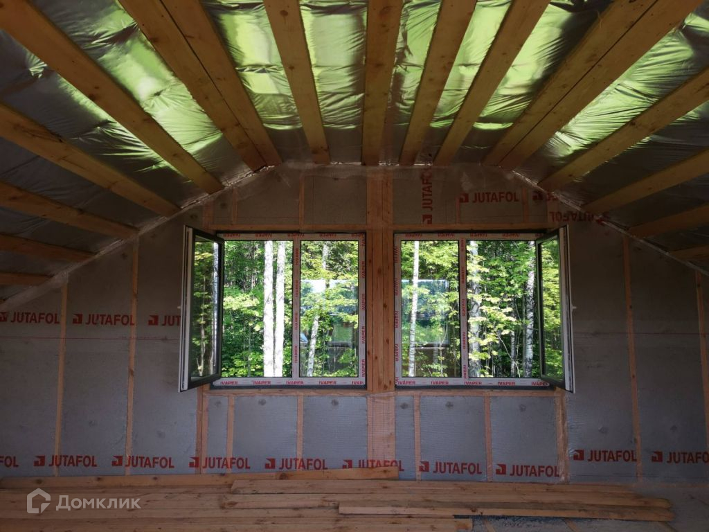 1. Фундамент - буронабивные     сваи, аналог обычных свай (не путать с винтовыми сваями), срок службы более 100 лет.2. Весь дом построен из сухого зимнего леса.3. Утепление стен,   - ЭКО вата (экологична, не гниет, огнестойка, отлично держит тепло, не оседает, хорошо отдает влагу в окружающую среду, хорошая шумоизоляция, этот утеплитель не любят грызуны, при укладке применялась выдувная установка (задувка), нет пустых полостей и плиты Белтермо для создания эффективной и экологически-чистой звуко и теплоизоляции, а также его ветрозащиты. Наружная облицовка металлосайдинг - не требует обслуживания.4. Крыша - Металлочерепица Grand Line Classic Satin 0, 5 мм (обычно покрывают более простым материалом толщиной 4-4, 5 мм) RAL 7024 серый цвет и необычная форма. Установлено снегозадержание на каждом скате и водосточная система. Крыша утеплена. Установлен короб (труба) для выведения вытяжки.5. Окна ламинированные - профиль немецкий, пять камер, повышенная шумоизоляция и теплоизоляция. Дополнительная солнцезащита - стекло благодаря инновационному напылению, отражает энергию в обе стороны, защищает помещение от излишнего тепла в летние дни, и сохраняет тепло внутри помещения зимой. Зимой данная опция помогает экономить на обогреве, сберегая в помещении тепло. В знойные дни она сохраняет прохладу. На первом этаже панорамное остекление с возможностью использования для выхода на улицу.6. Дверь входная изготовлена с терморазрывом - не образуется точка росы, не промерзает, не перегревается летом, шумо-теплоизолирована.