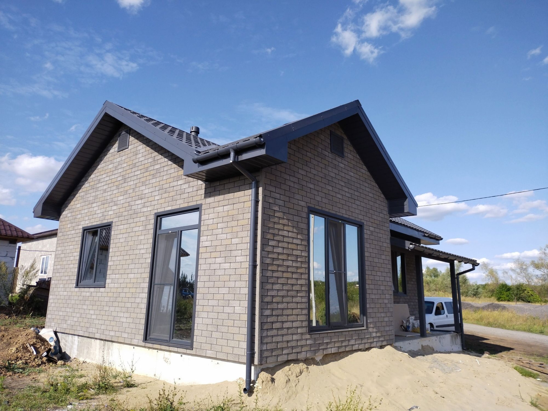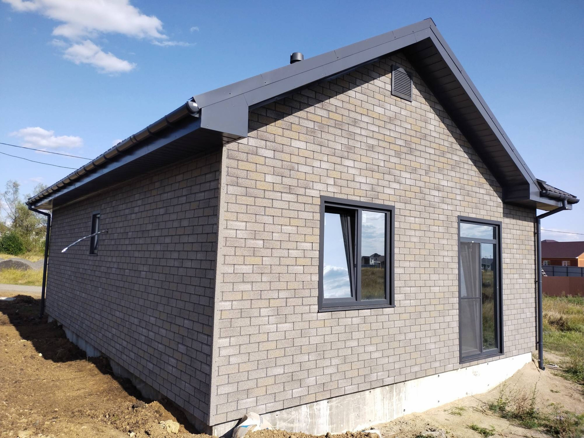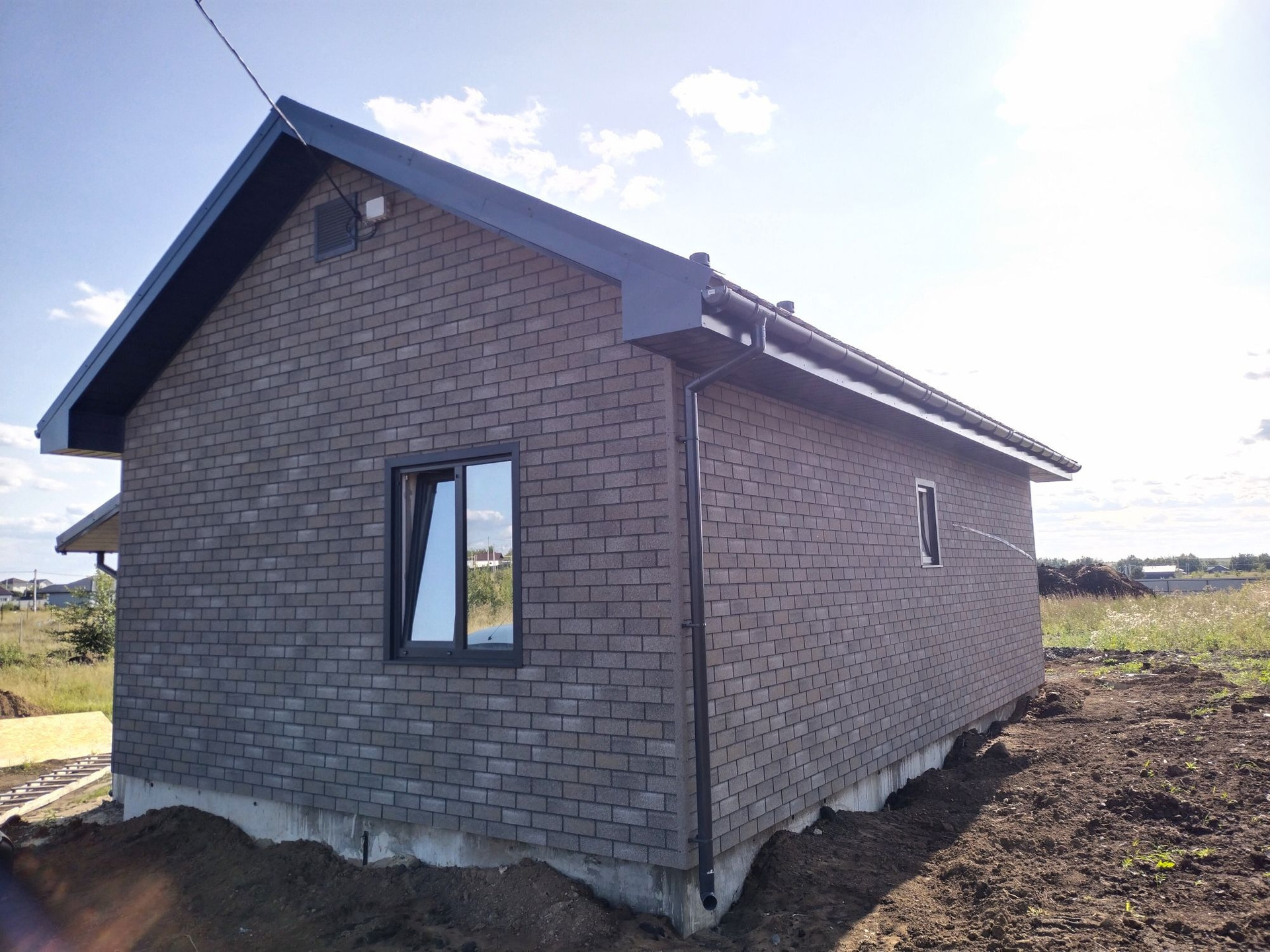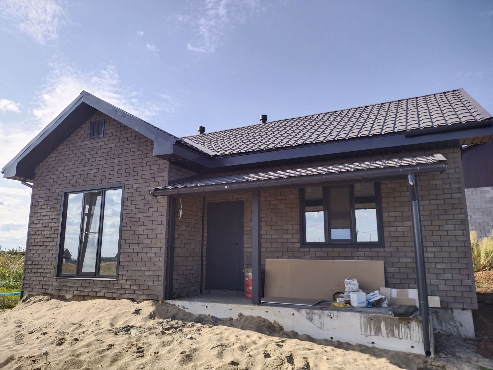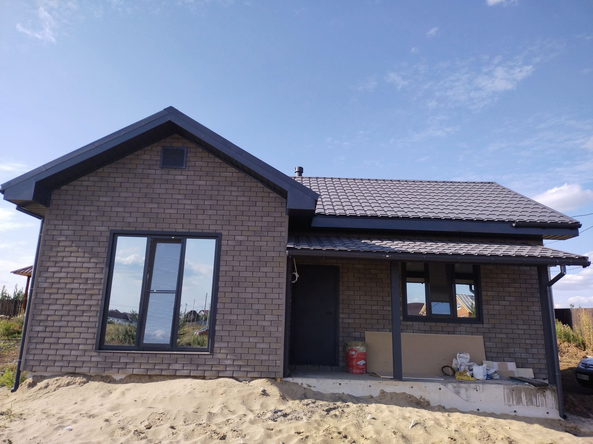 Стены дома утепленны в 200мм что придаёт дополнительную шумоизоляцию и исключает мостик холода. Внешняя отделка фасадная плитка хауберк, внутренняя гипсокартон в 2 слоя со штукатуркой под чистовую.