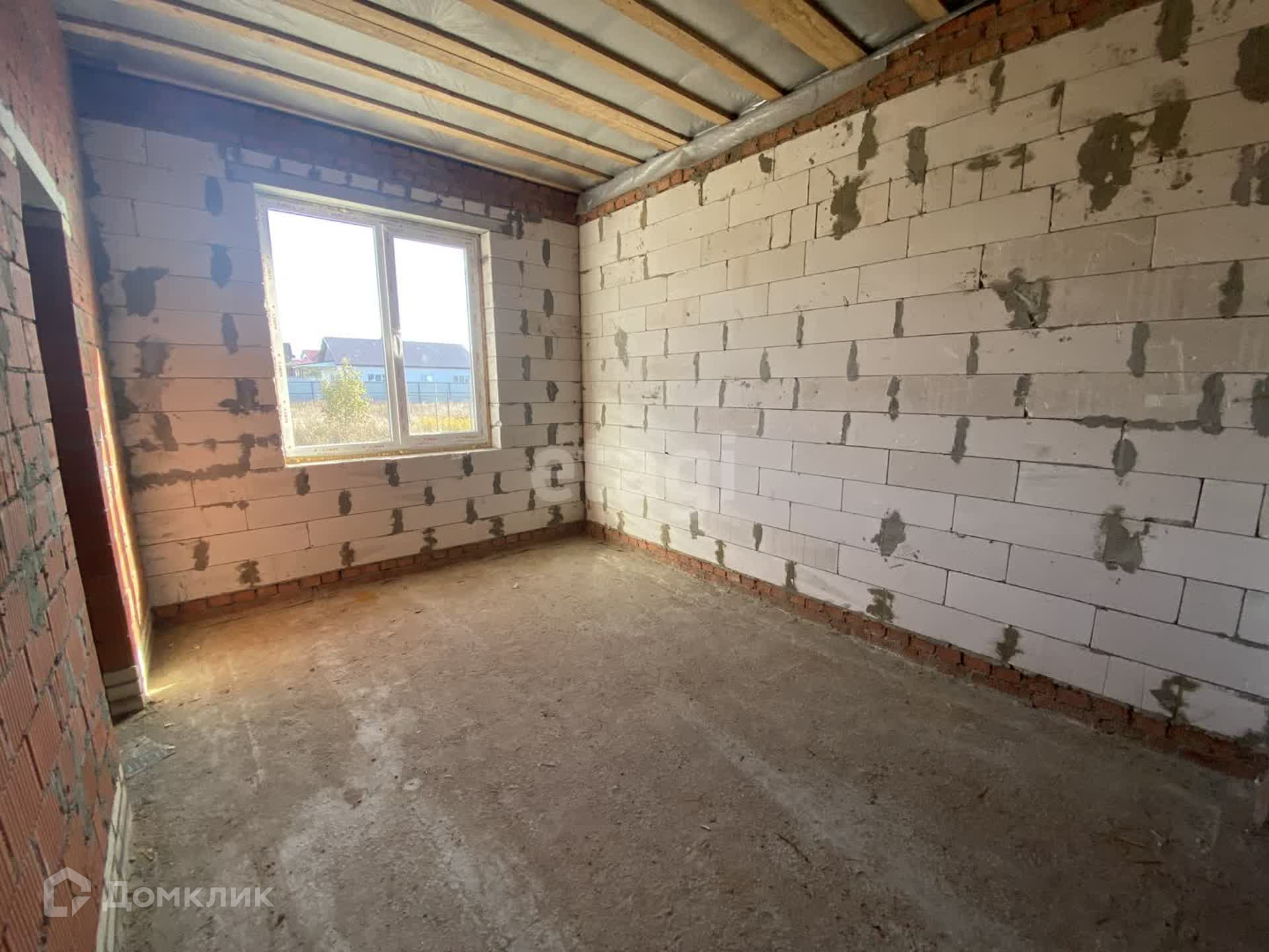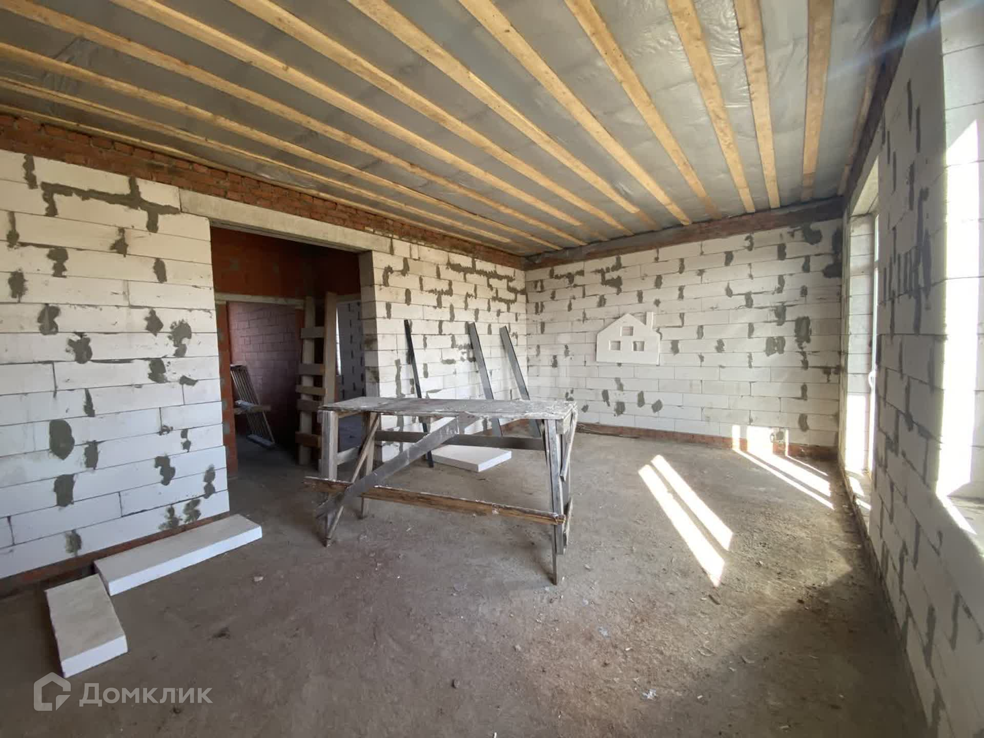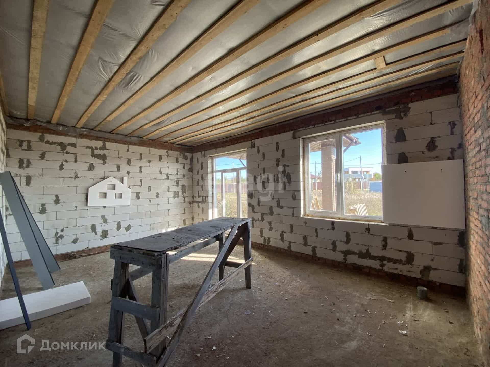 Стены дома из газосиликатных блоков снаружи утеплены пенопластом, оштукатурены и окрашены (технология мокрый фасад). Крыша с деревянными перекрытиями, утепленными по потолку.