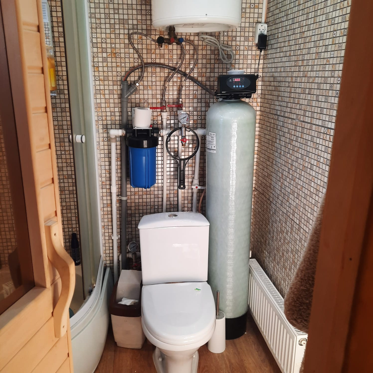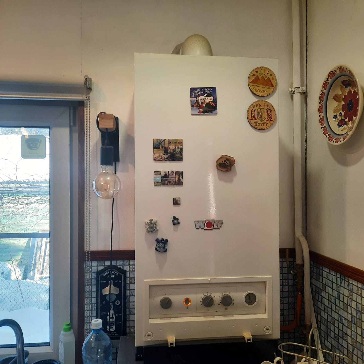 По всему дому установлены батареи, общим счётом 10 штук. Отопление газовое. Котёл двухконтурный ВОЛЬФ.