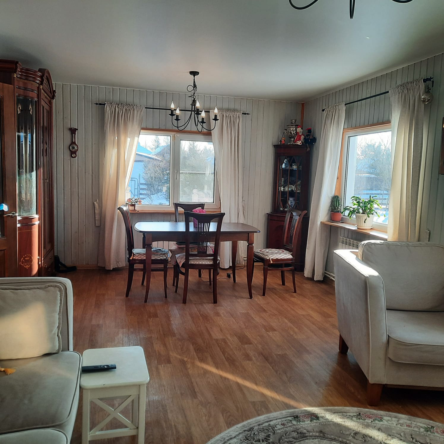 Дом тёплый. Установлен на ленточном фундаменте со сваями. Полы многослойные- чёрный пол  утеплитель Роквел 200 мм. Стены  утеплитель 150 мм. Дом обшит сайдингом светло-кофейного цвета. Крыша  металлочерепица.