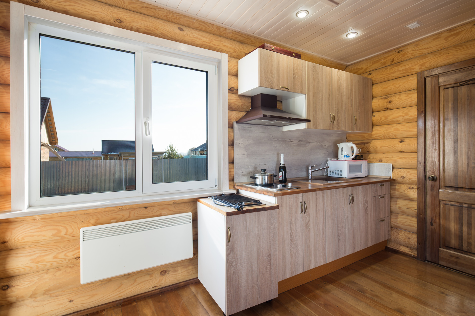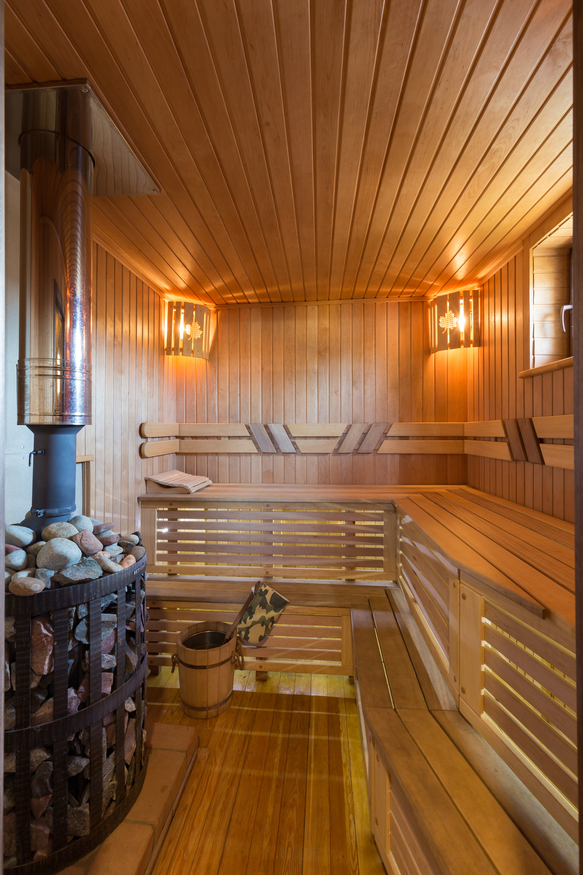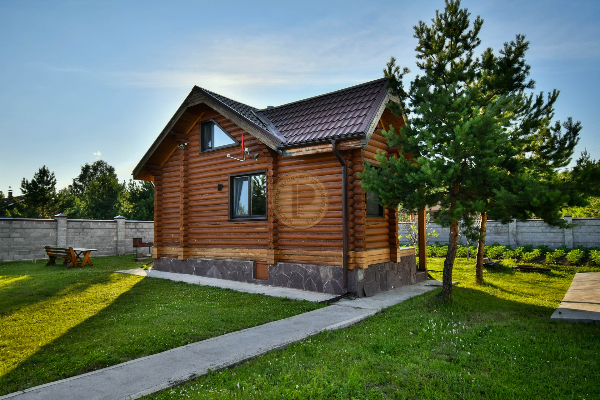 Гостевой дом с баней площадью 65м2 сложен из оцилиндрованного бревна. На мансарде находится спальня с системами хранения, а на первом этаже гостевого дома расположены гостиная с кухней, санузел, русская сауна-баня с душевой из лиственницы. Здесь можно проводить время в теплой компании друзей или семьи, за просмотром фильмов или в тихой обстановке, наблюдая, как горит огонь в печи. Кроме дровяной печи, дом обогревается конвекторами.