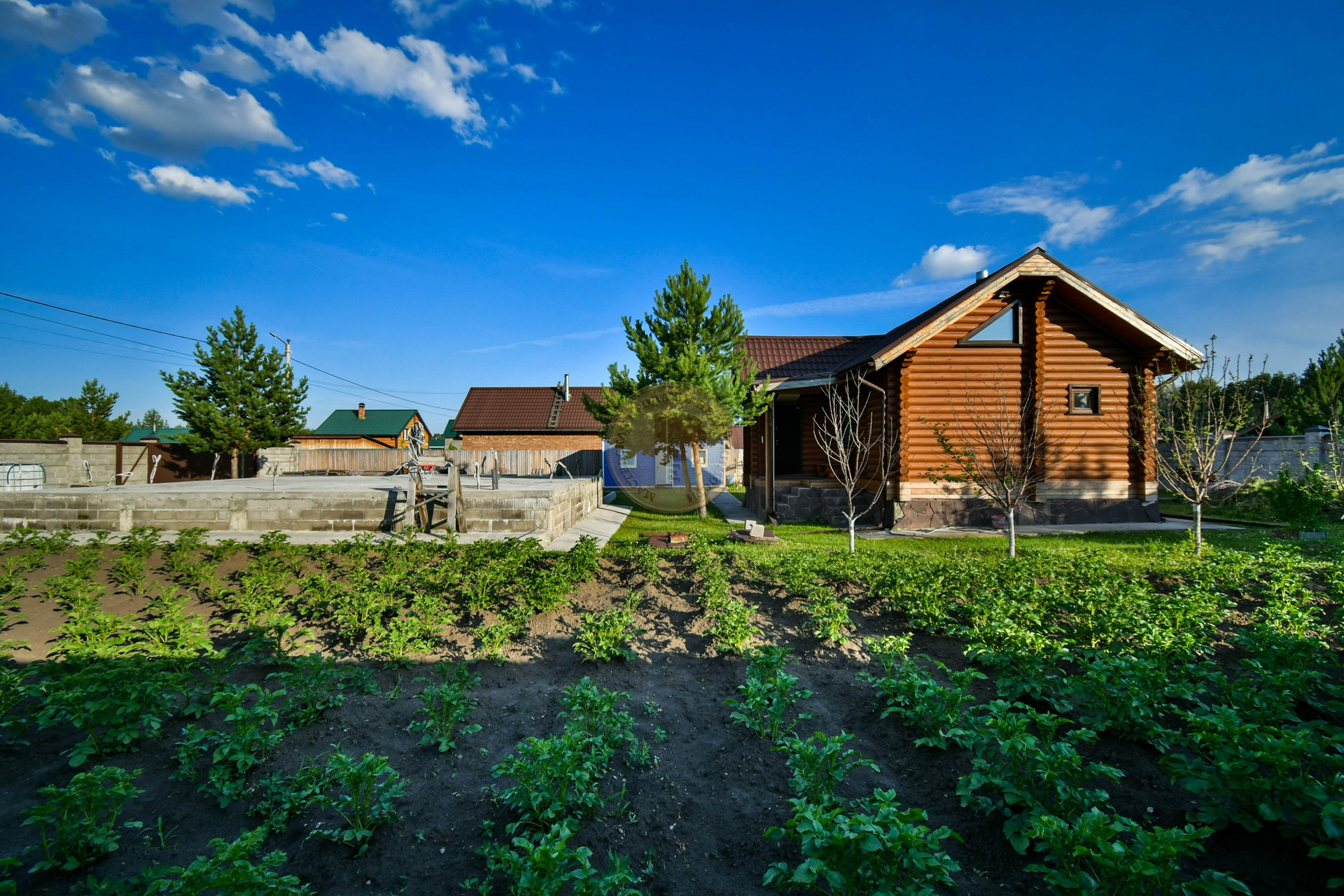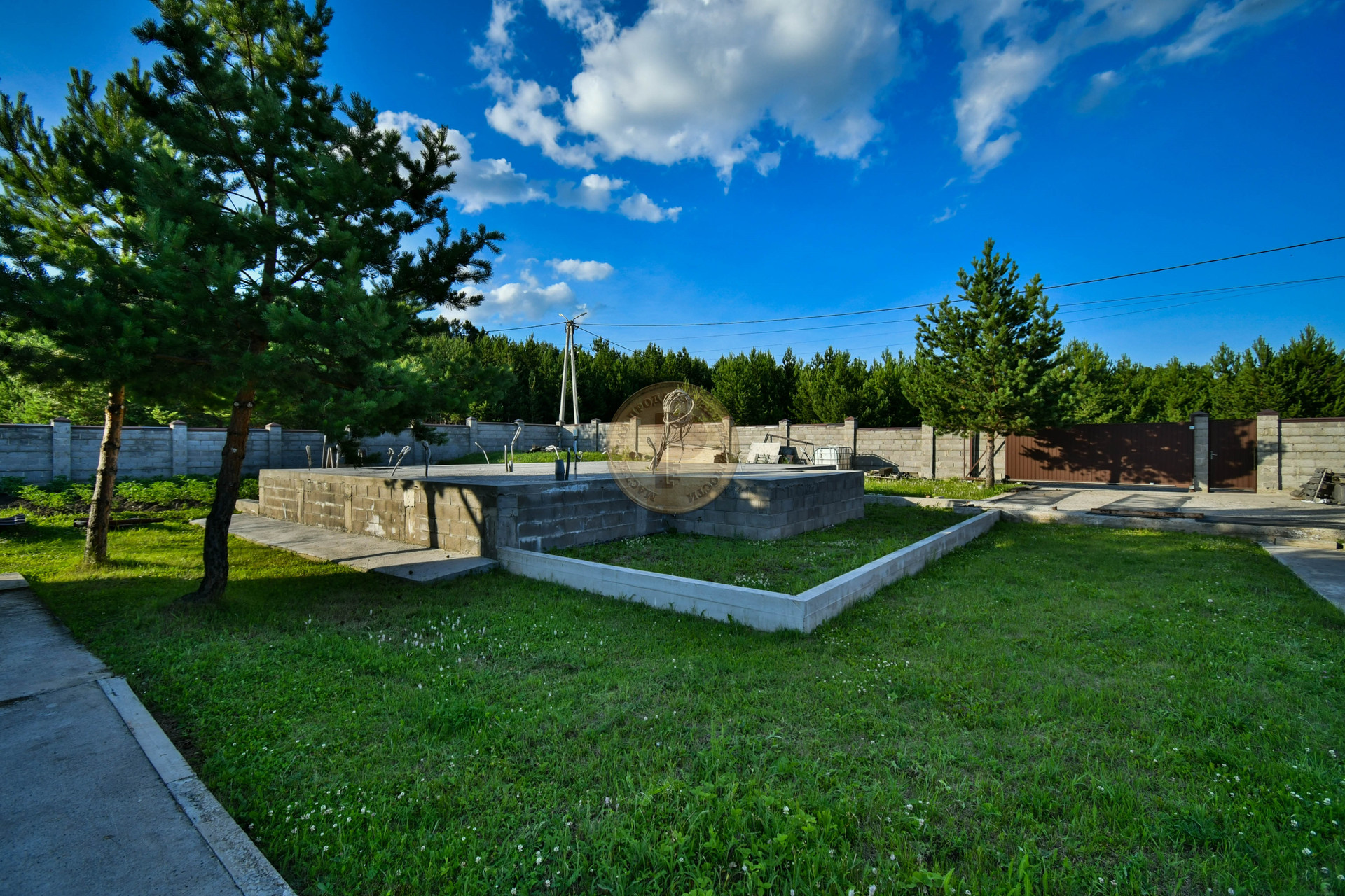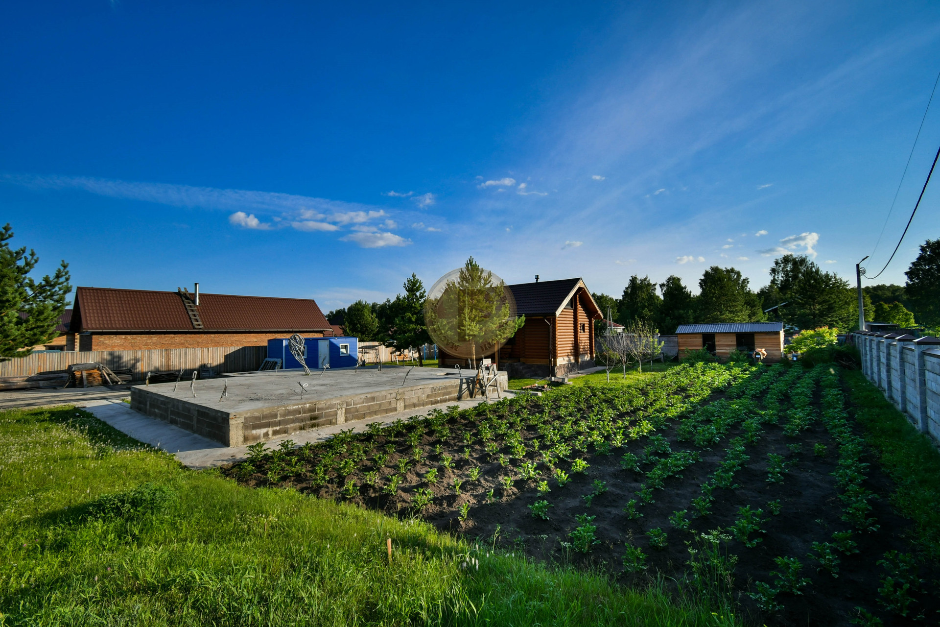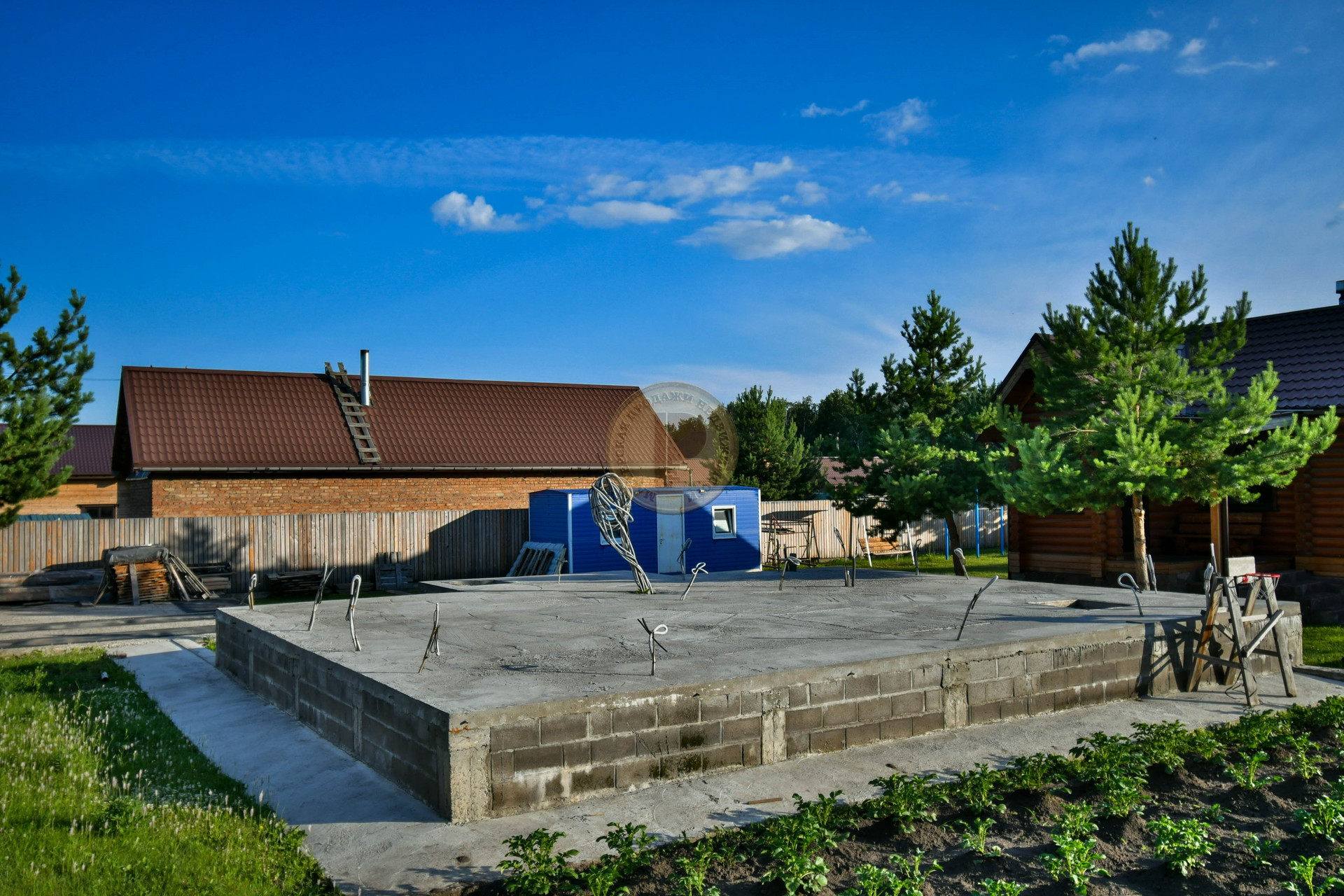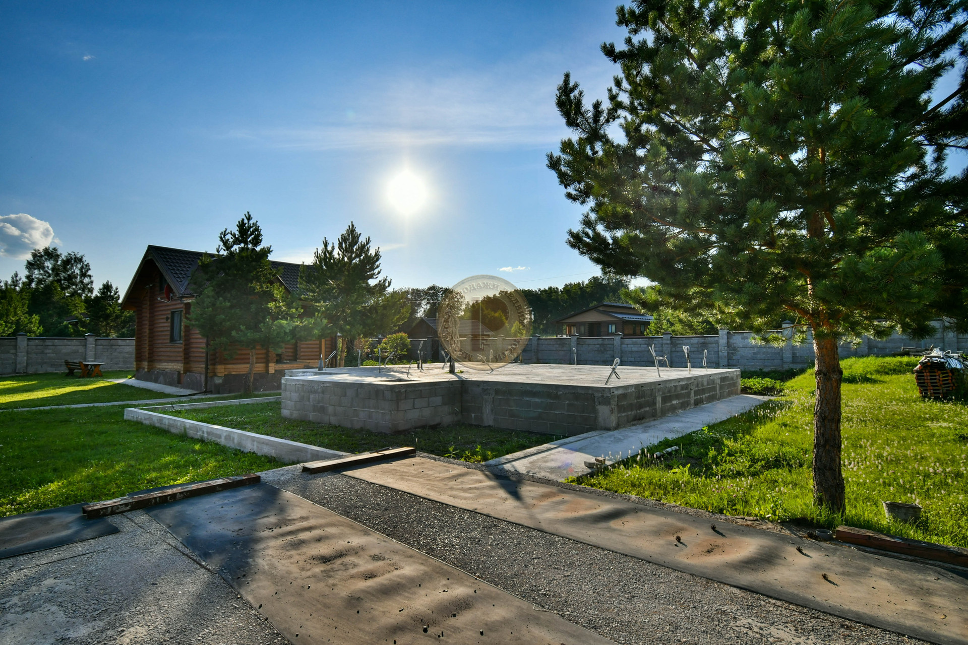 Для постройки дома уже подготовлен нулевой цикл - фундамент размером 11х9 м. Фундамент рассчитан для возведения стен из любого материала: будь-то дерево, монолит, кирпич или блок. Уже оформлено разрешение для строительства дома высотой не более 3-х этажей. В фундаменте проложены все коммуникации, также как и в гостевом бревенчатом доме: вода, канализация и электричество.