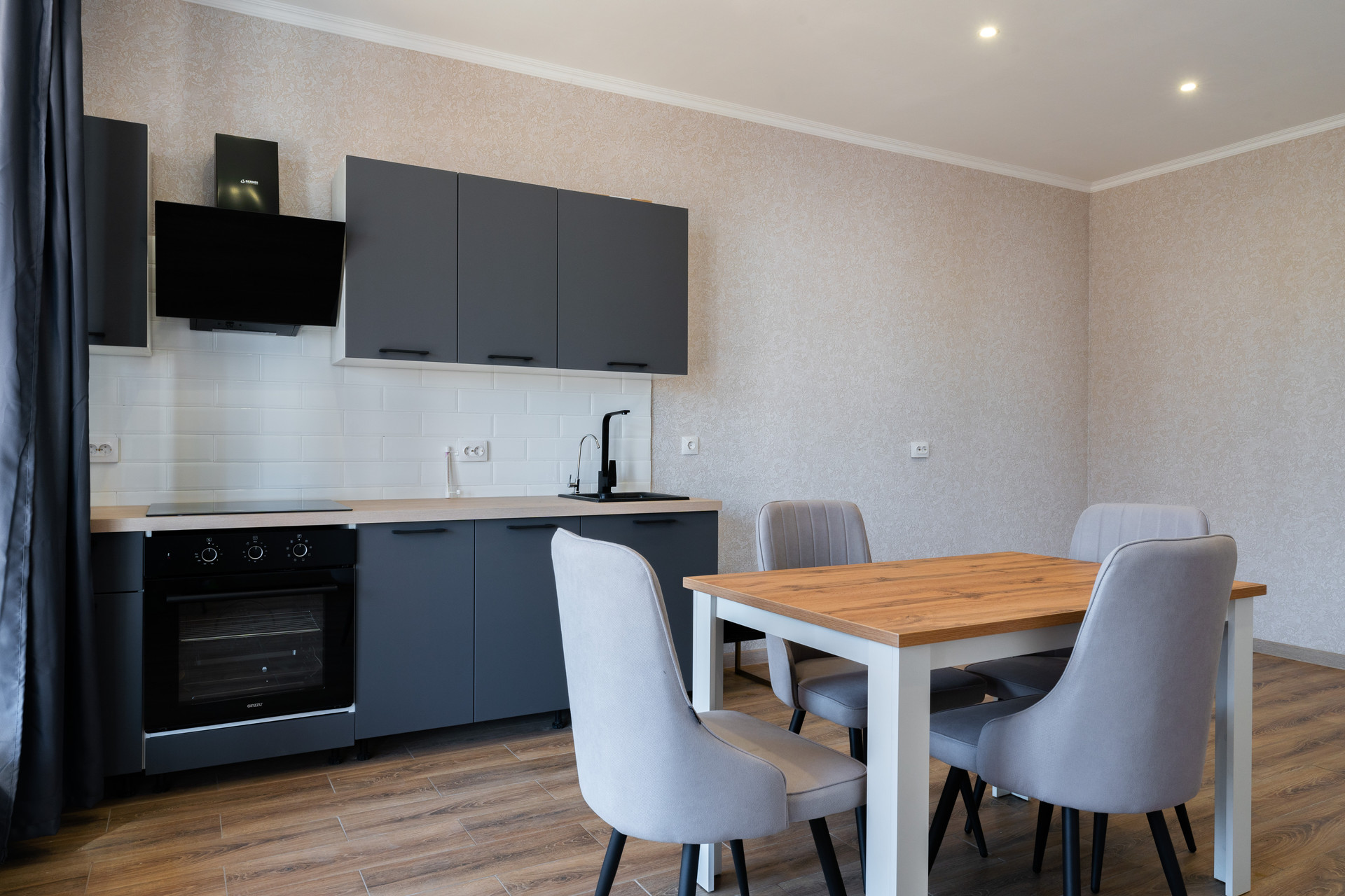 • полностью оборудованная кухня с встроенной варочной панелью и встроенным духовым шкафом