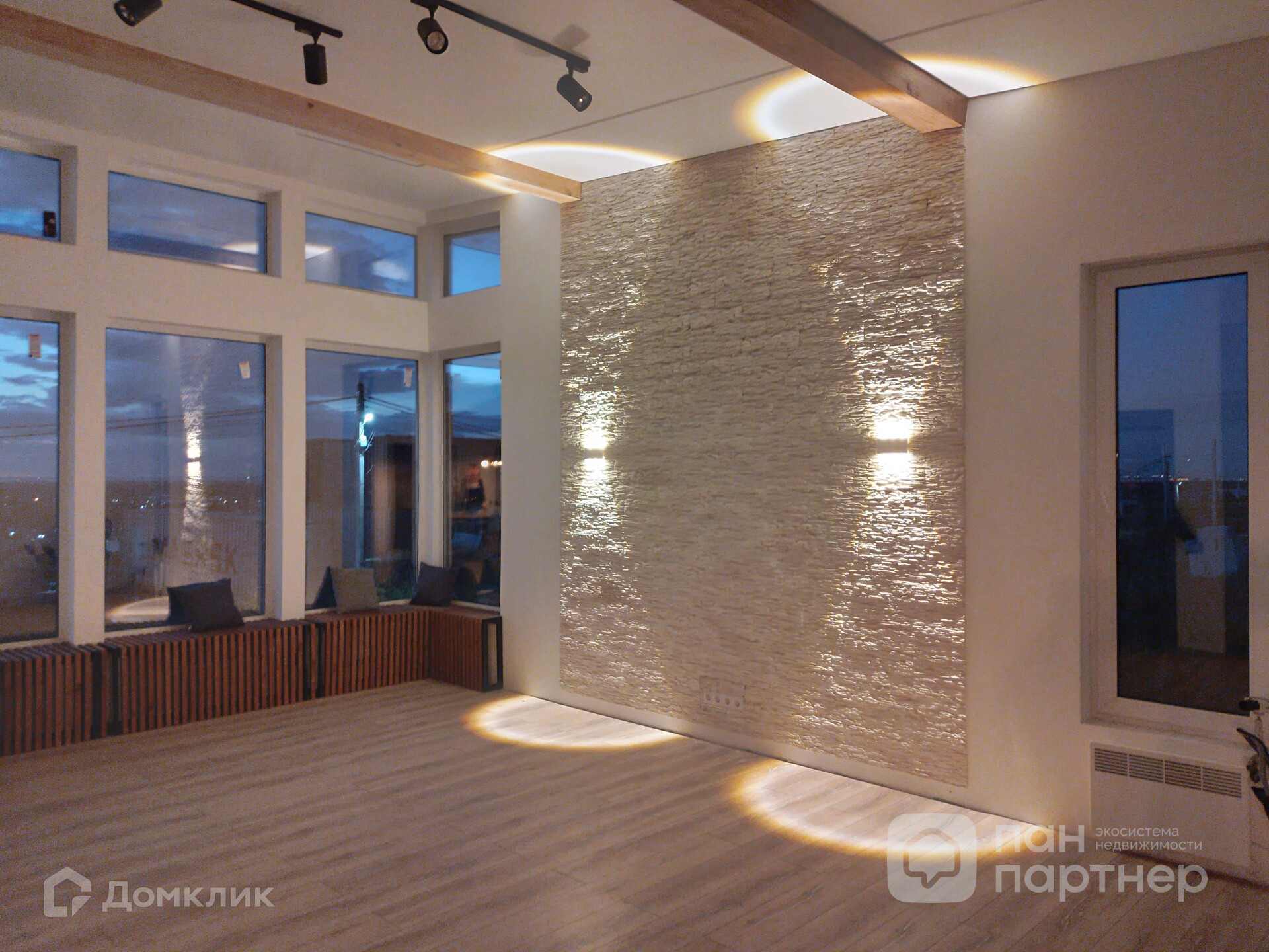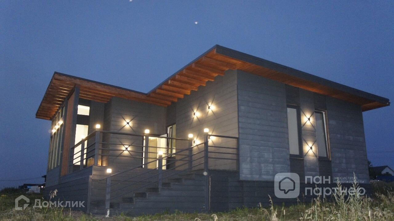 По периметру фасада, террасе и внутри дома - установлено дизайнерское освещение.