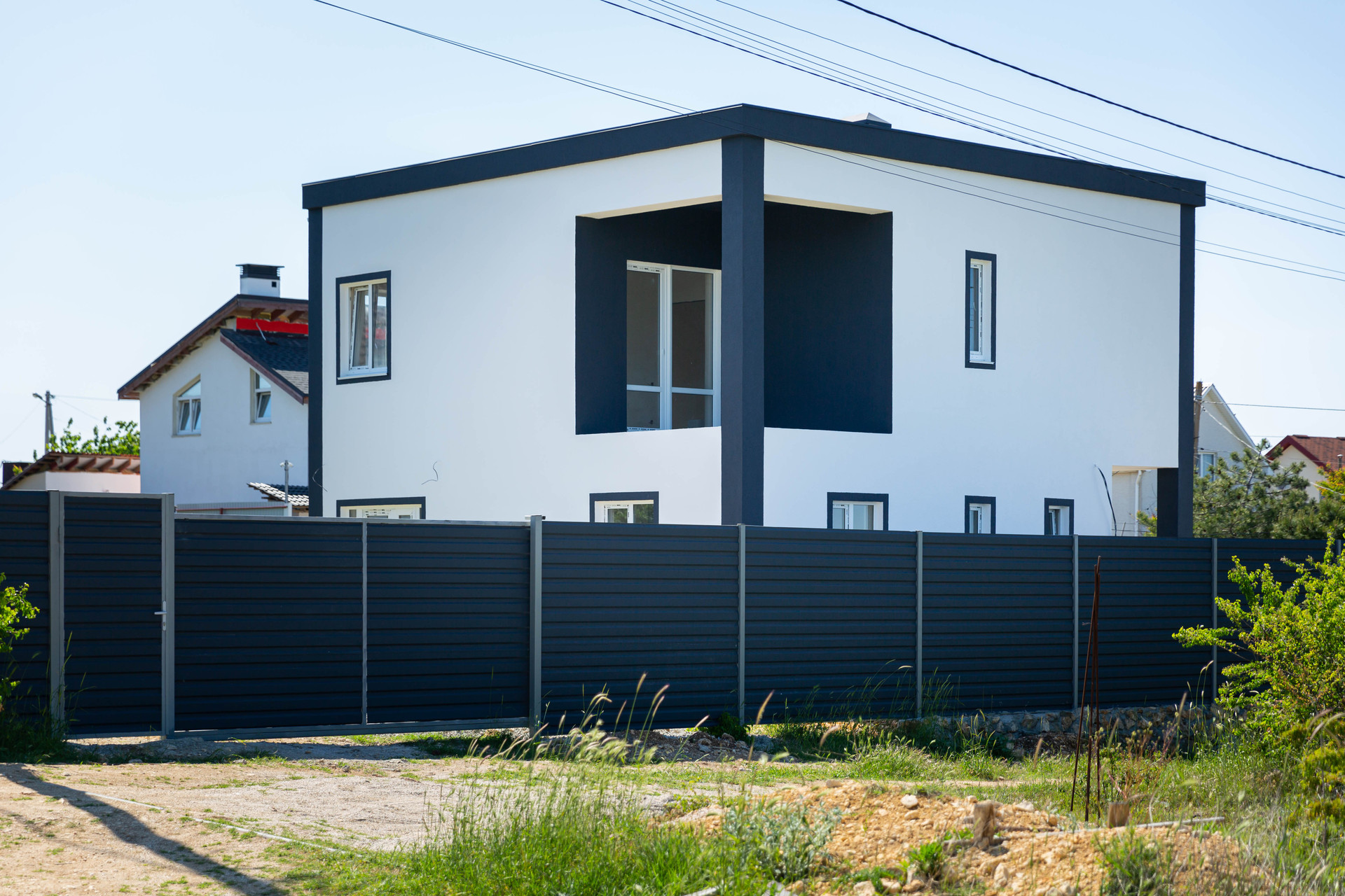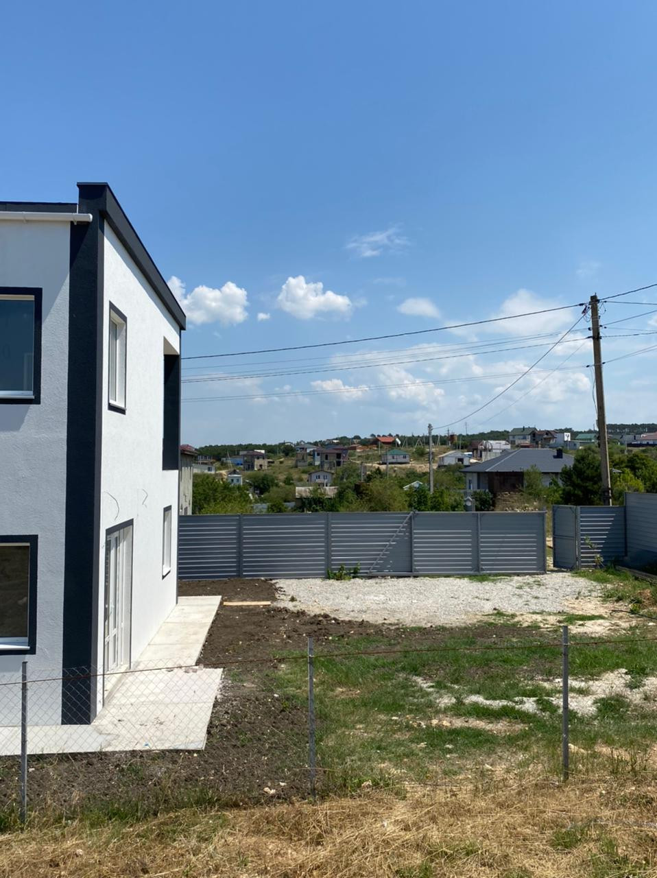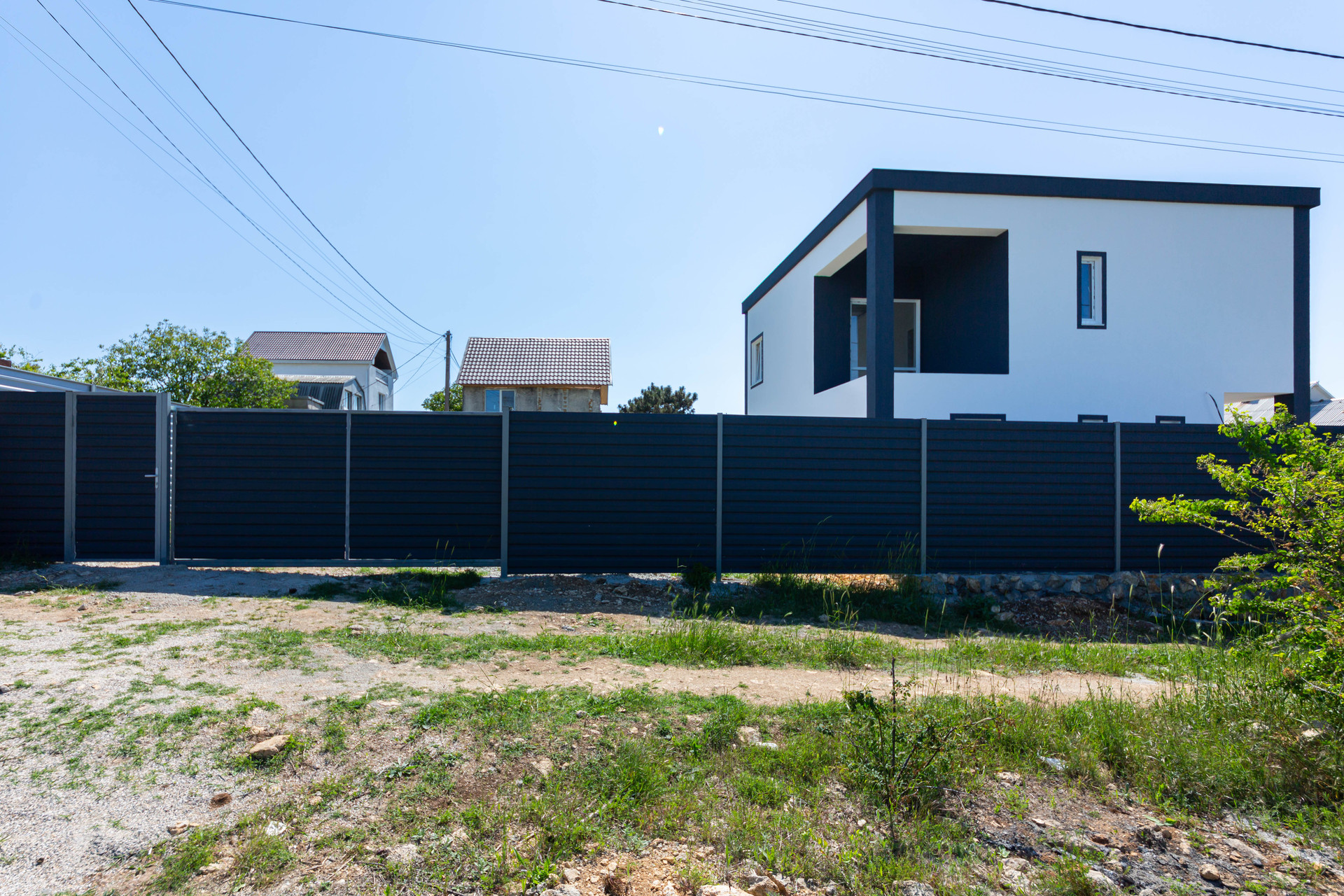 Дом ограждён металлическим забором с воротами.