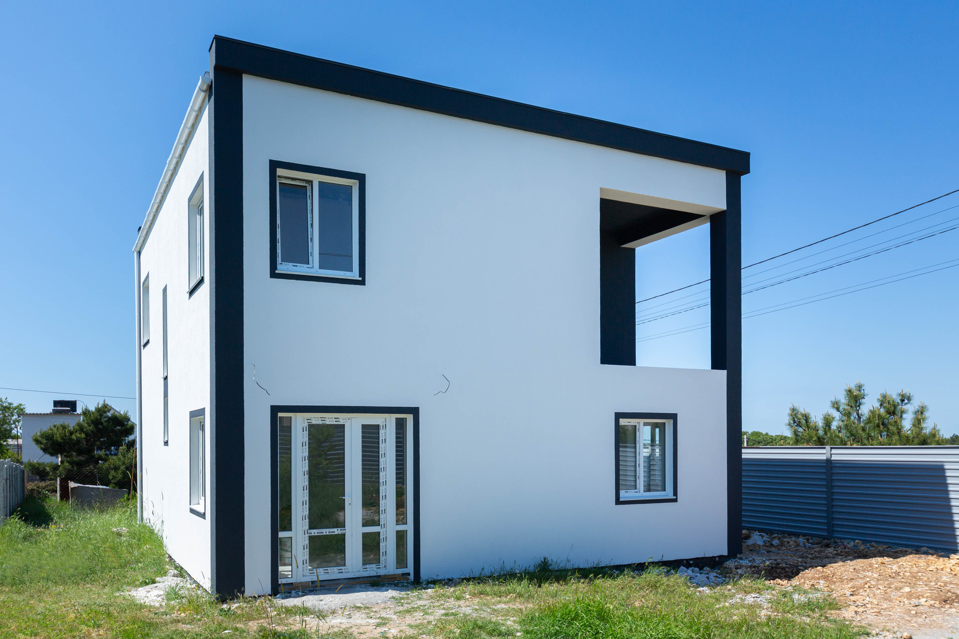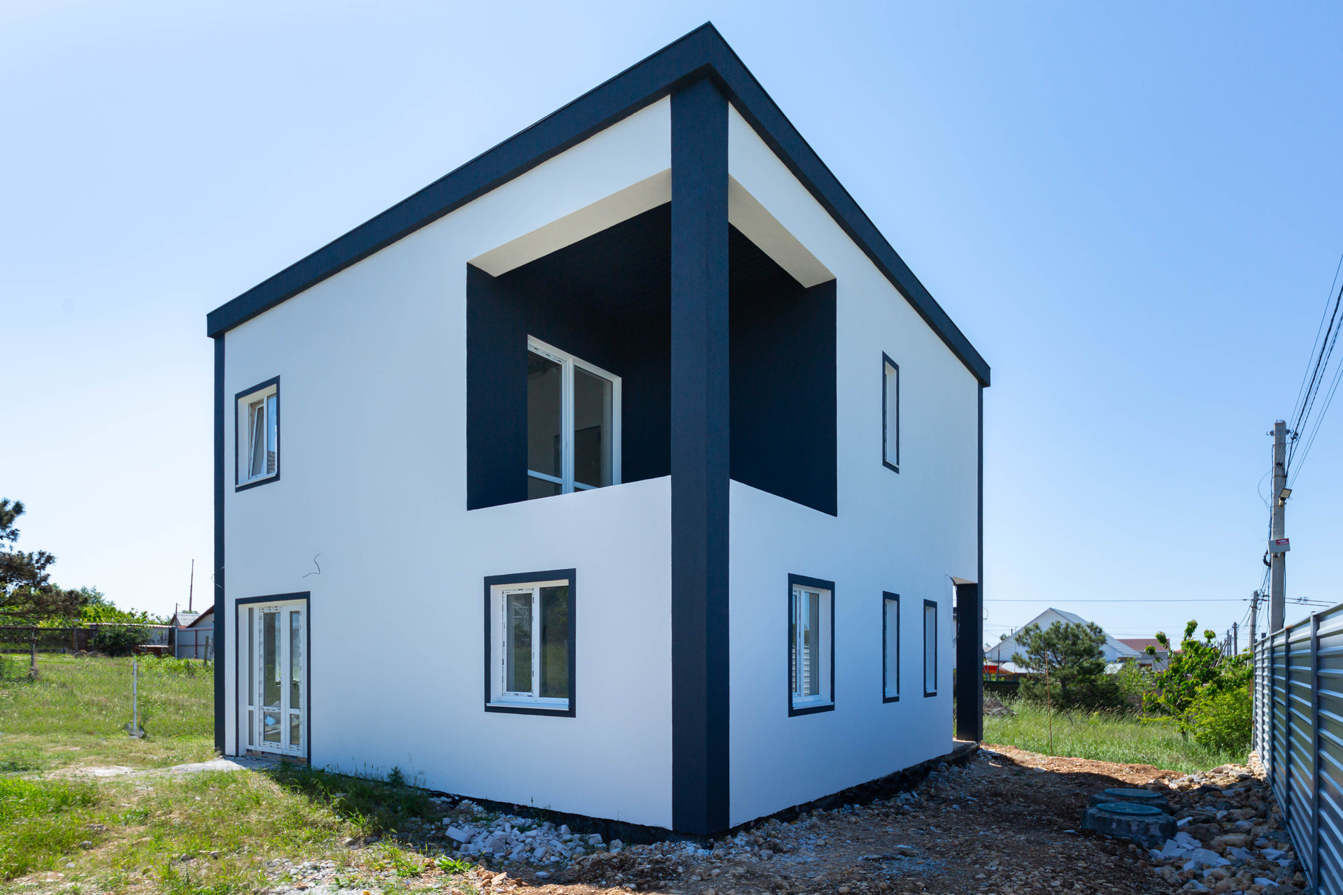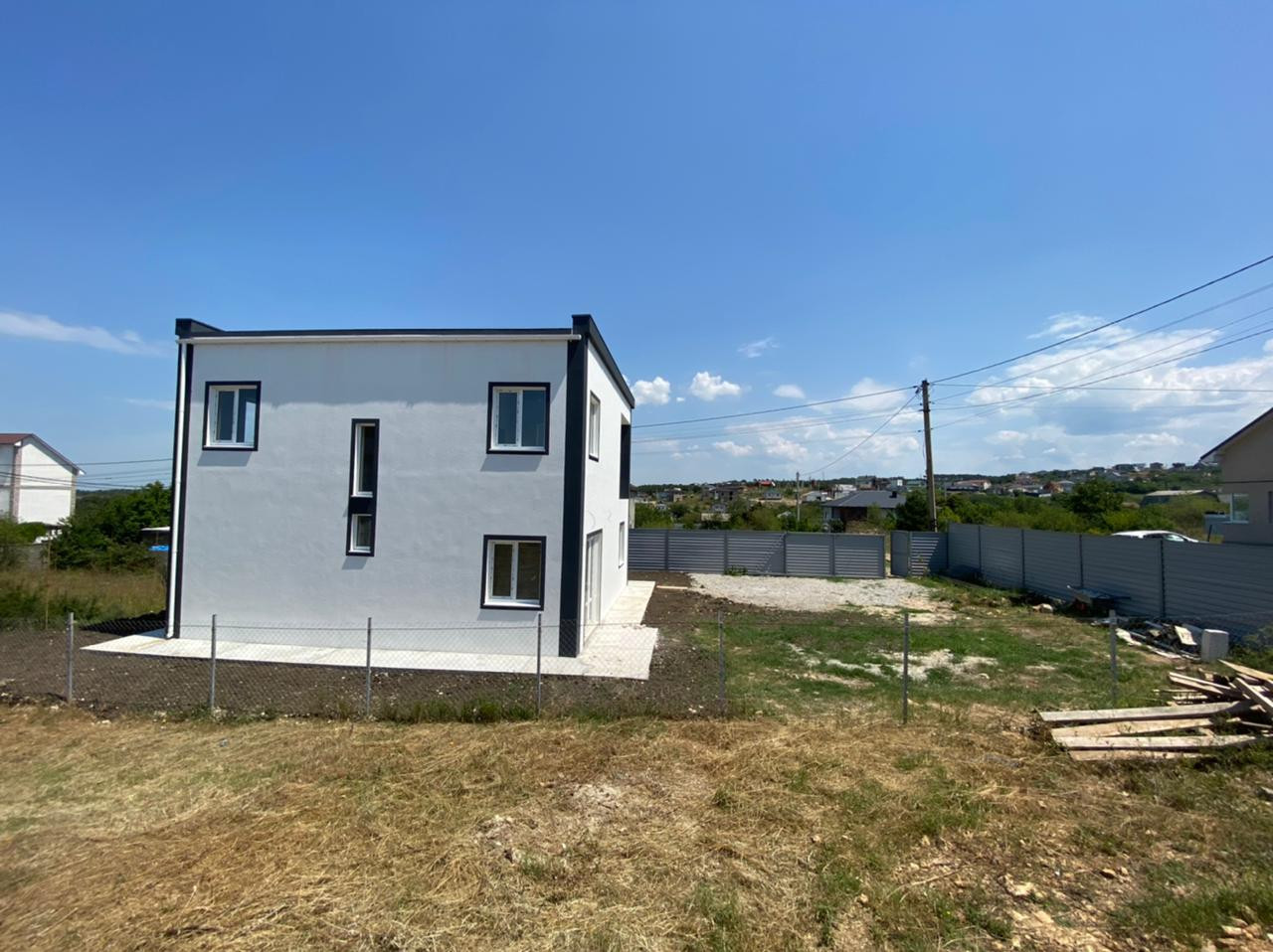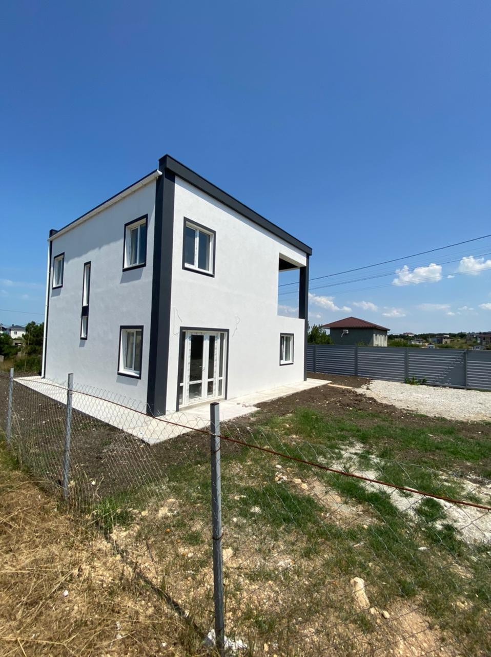 Дом ограждён металлическим забором с воротами.