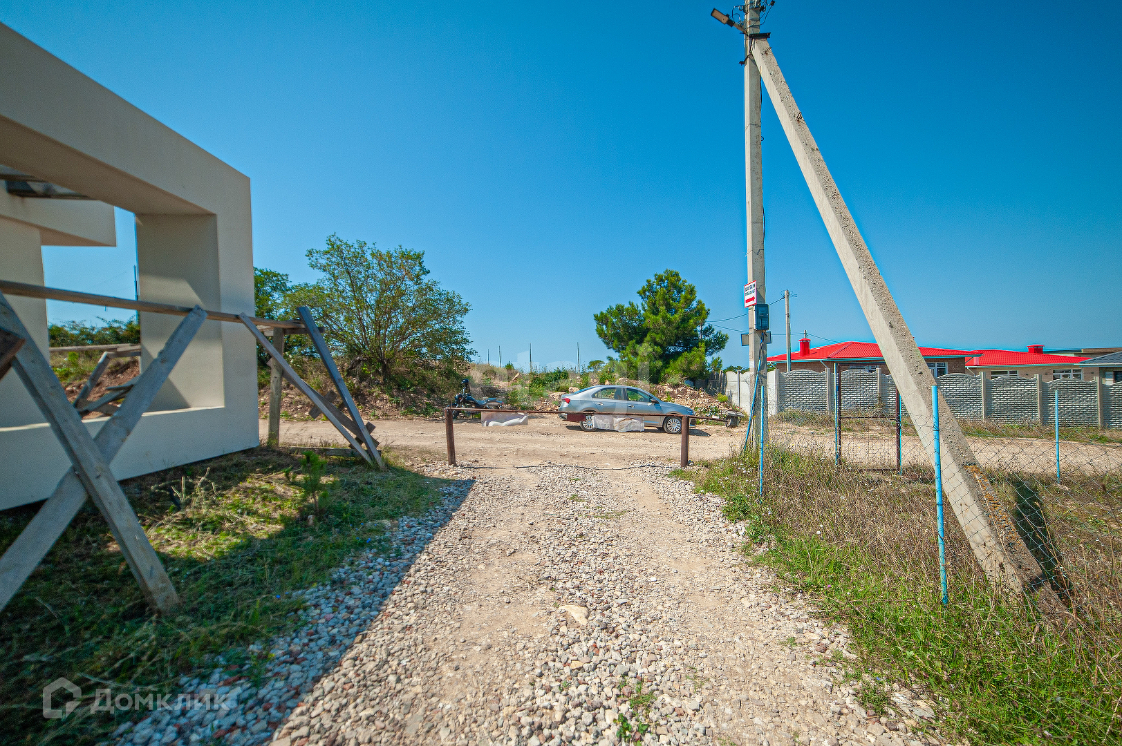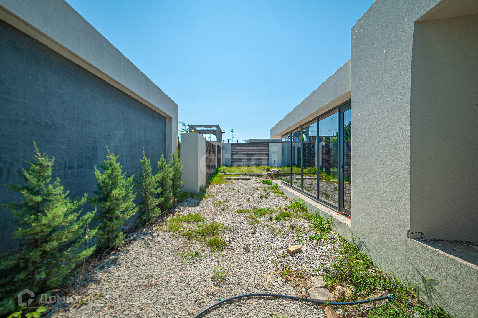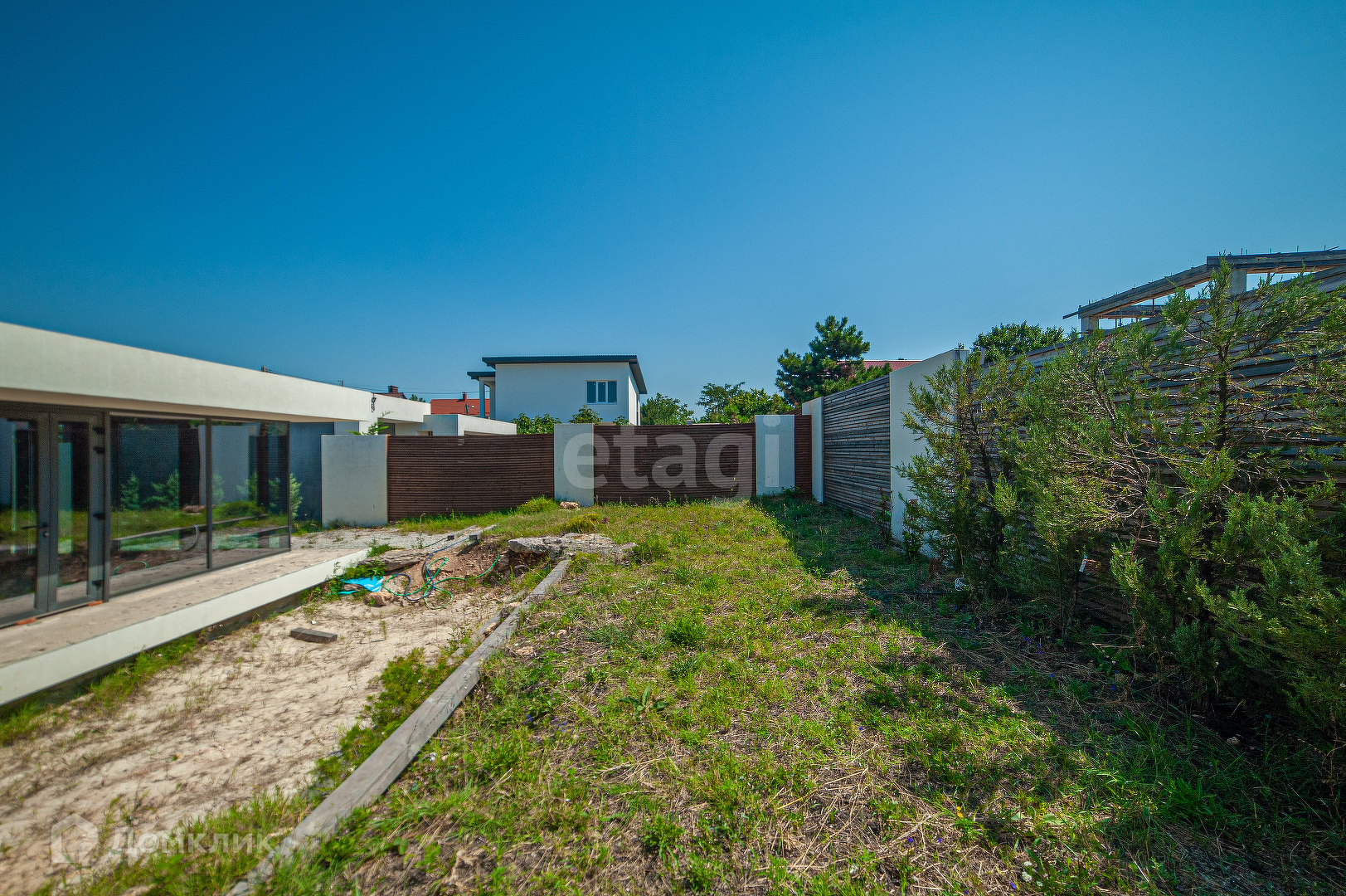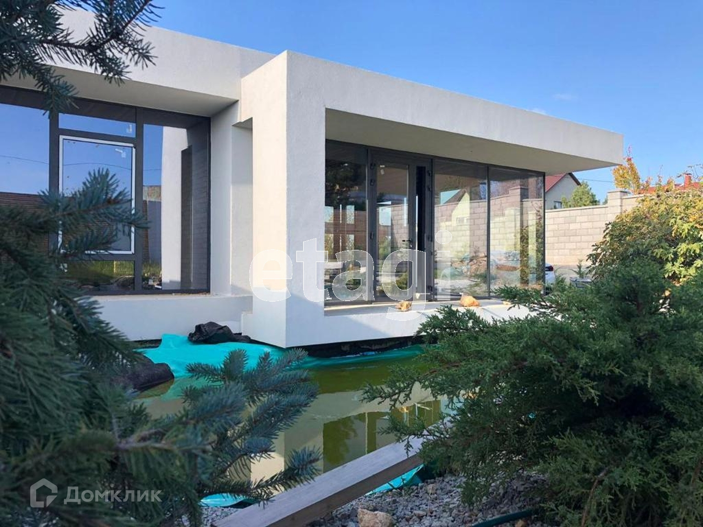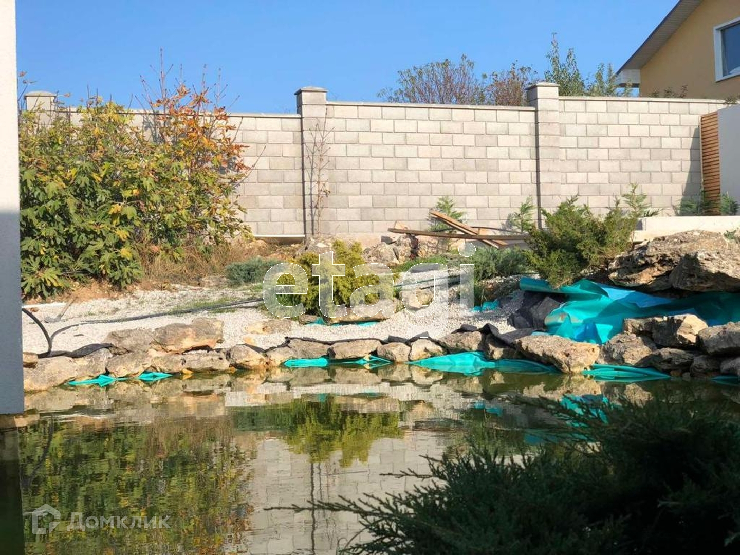 Участок квадратный, ровный, площадью 4 сотки. Рядом с террасой сделан пруд. Территория вся огорожена каменным забором с добавлением деревянных элементов. При въезде на участок установлены автоматические ролевые ворота.На участке высажены декоративные, вечно зеленые растения. Территория чистая и ухоженная. Асфальтированная дорога идет до самого дома.