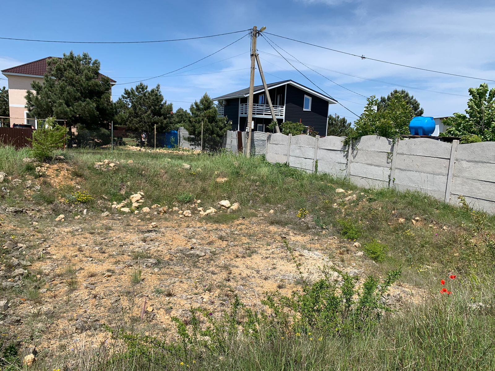 На участке вырыт котлован . Есть возможность подключения водопровода от скважин ТСН. Возможно подключение к круглосуточной городской воде.На участке подключён свет 15кВт.