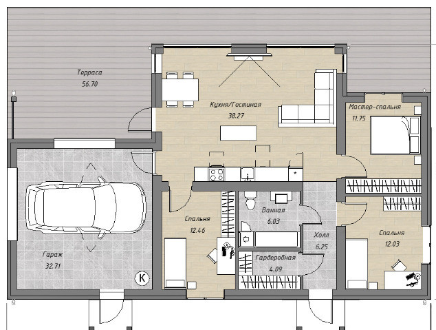 Дом имеет шикарную кухню гостиную с высокими потолками и панарамными окнами + 3 спальни!!!