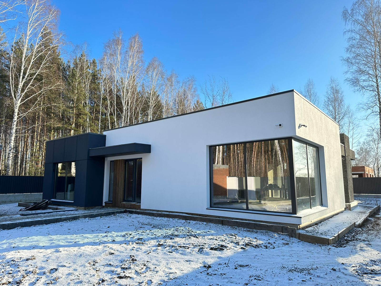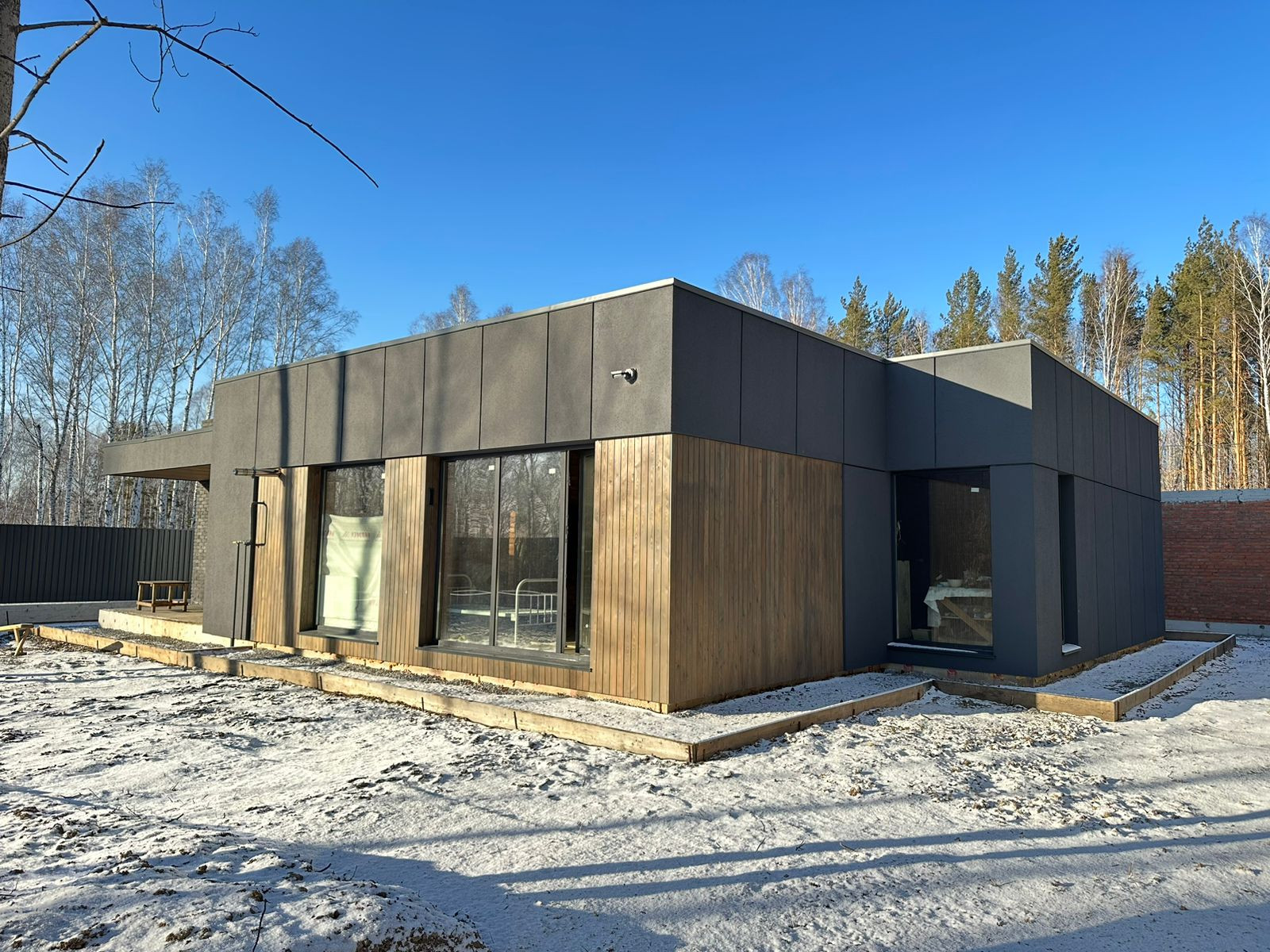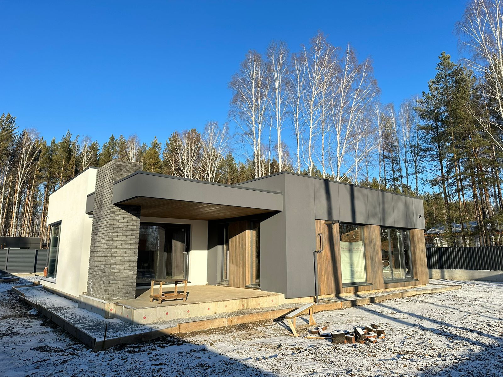 • Стены: 250 мм кирпич керамический полнотелый ЗСМ7, фасадный утеплитель 150 мм, штукатурный фасад Ceresit; планкен;