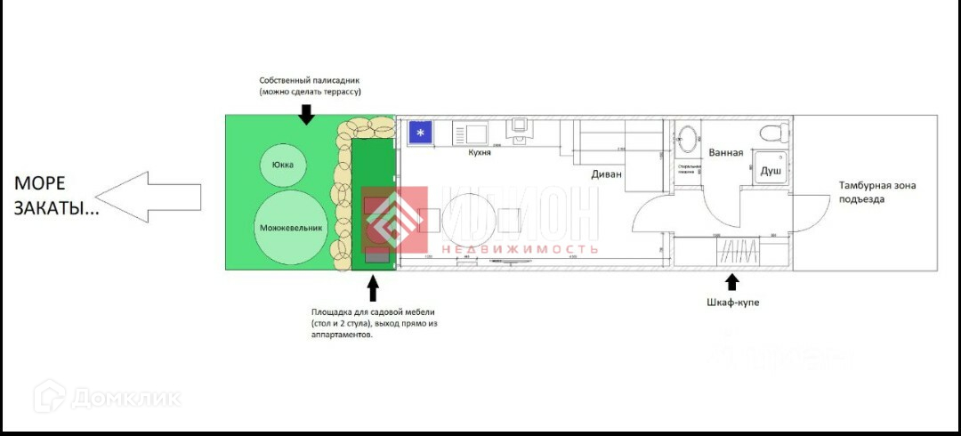 Апартаменты находятся в идеальной зоне  в отдалённости от мангальной зоны и детской площадки, а также в стороне от шлагбаума. Вид на море, но нет прямого ветра с моря! Рядом соседняя терраса защищает от солнца в полдень! С собственным палисадником. Вид из окна на море и закаты.