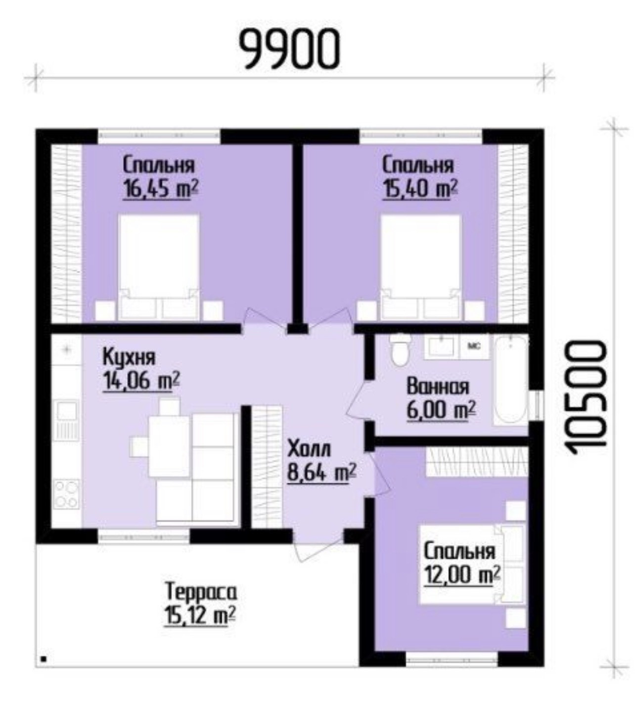 - помещения: 3 спальни, ванная, кухня-гостиная, санузел, холл, терраса.