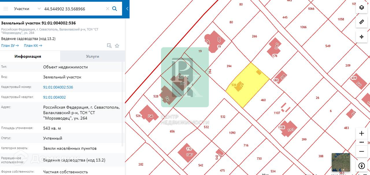 Дом 21,1 м² на участке 5,4 сотки, одноэтажный, зарегистрированный как жилой. Расположен в г. Севастополь, Балаклавский район, ТСН "СТ "Морзаводец". Коммуникации: электричество, водоснабжение. На участке есть зарегистрированное нежилое здание ( сарай ) - 6 м².