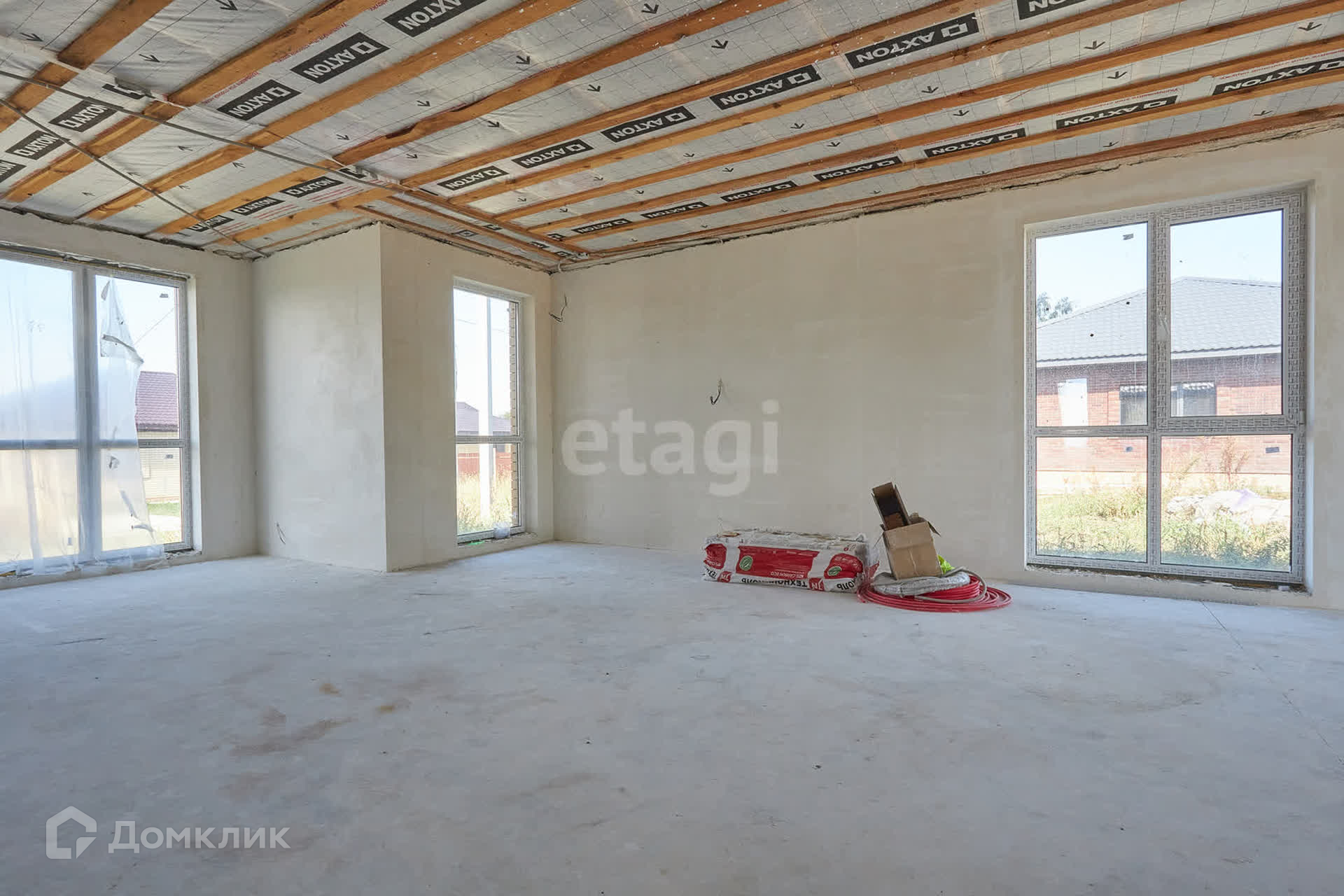 Дом с витражным остеклением. Вокруг дома залита отмостка, терраса и парковка для автомобиля. В доме выполнена предчистовая отделка, оштукатурены и отшпаклеваны стены под обои, разведена электрическая проводка, сделан теплый пол, стяжка, отопление ГАЗОВЫМ котлом!