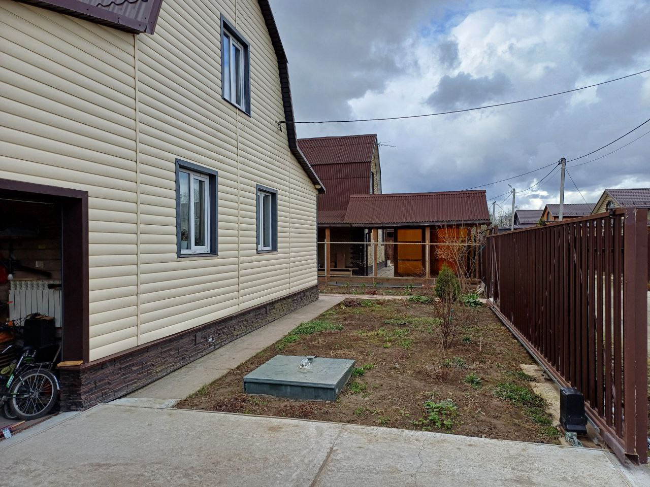 Снаружи дом обшит сайдингом с утеплением. В гараже установлены автоматические электрические ворота. Въезд на территорию дома и участка осуществляется через откатные электрические ворота.