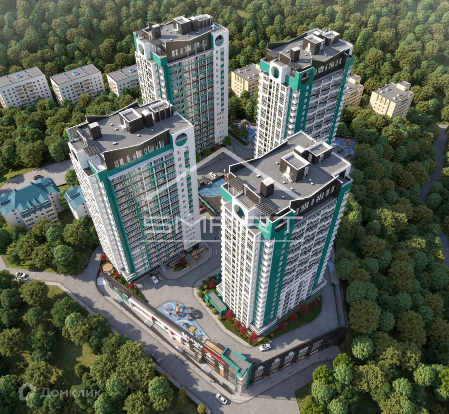 Навесные вентилируемые фасады домов облицованы керамогранитом белых и голубых оттенков. Также в комплексе предусмотрены многоступенчатая система очистки воды и собственная котельная.