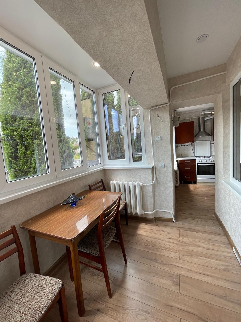 В квартире комнаты смежные, просторная лоджия, санузел совмещен.