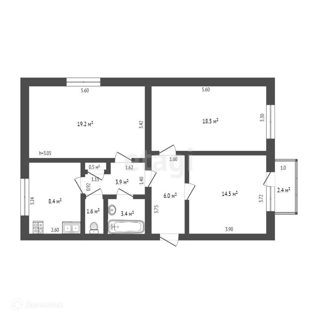 Общая площадь 55.5 м2