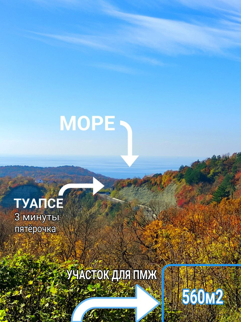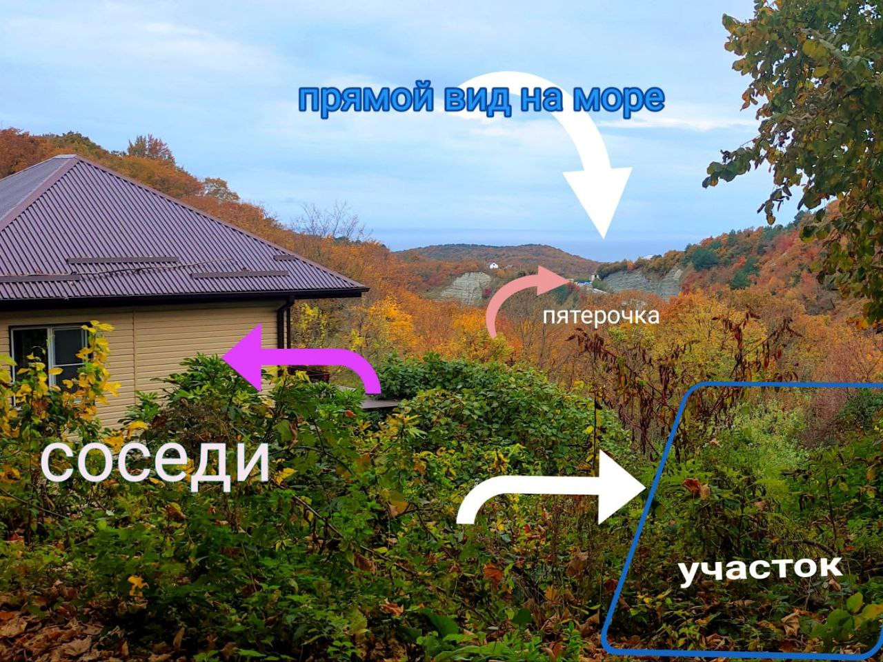 Про участок: Самое важное при покупке участка на юге -это вид на море. Ведь, ради этого мы и переезжаем сюда. У вас будет шикарный, прямой вид на море, рядом большой город со всей инфраструктурой: магазины, школы, садики, банки и т.д. Соседи живут круглый год. За участком лес, тропы для любителей прогулок, водопады, горы. Обожаемый лично мной, самый свежий морской воздух. В этом климате растет хурма, персики и инжир.