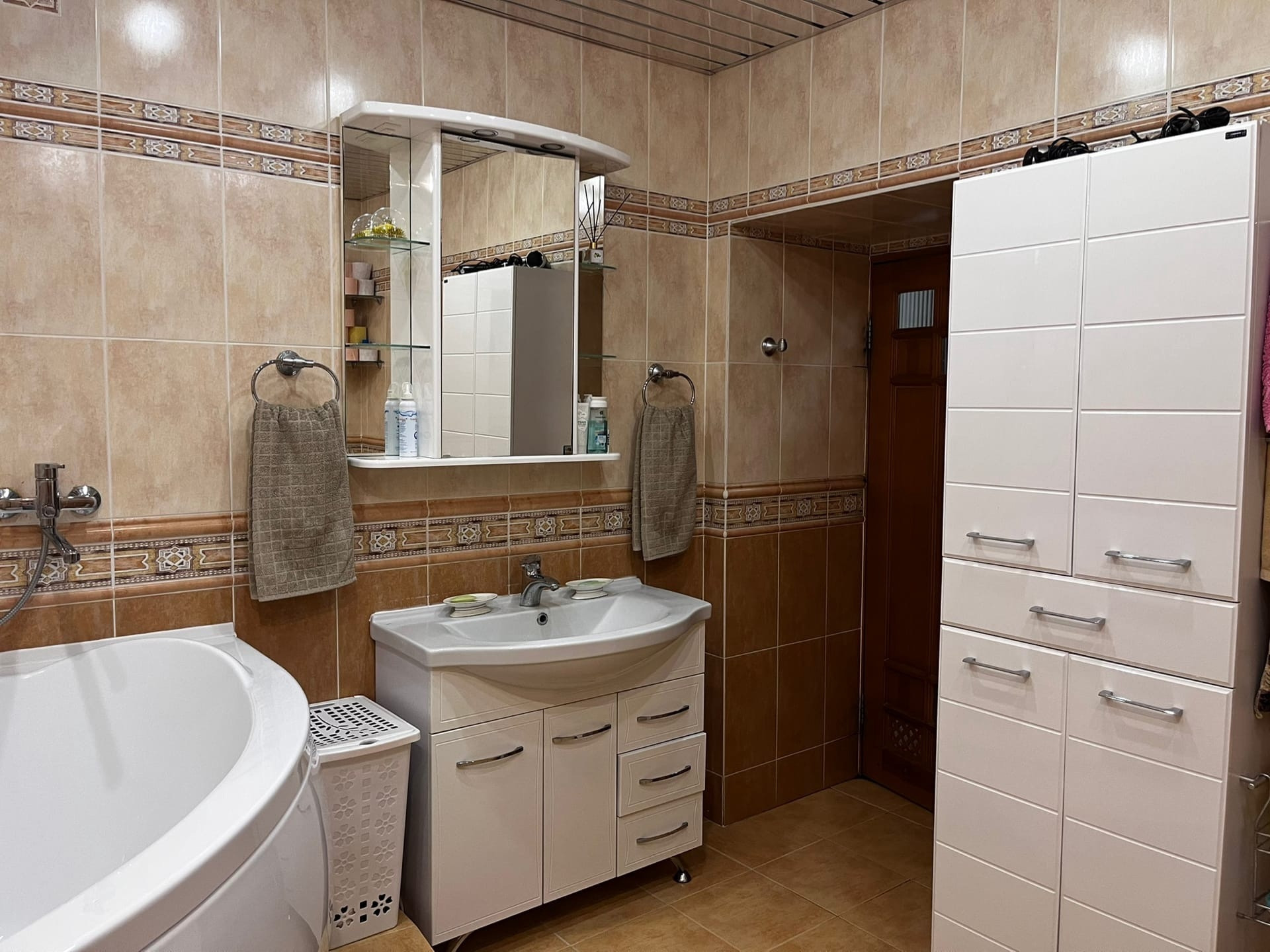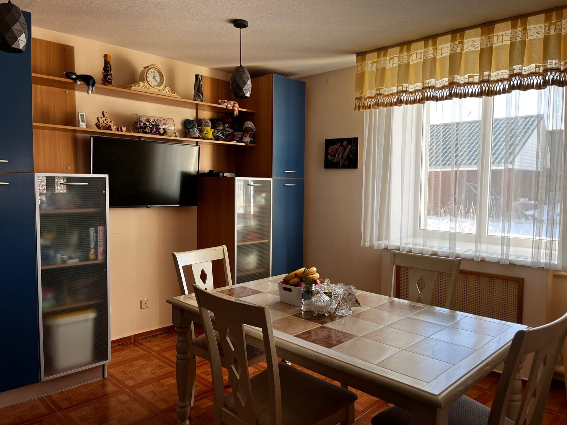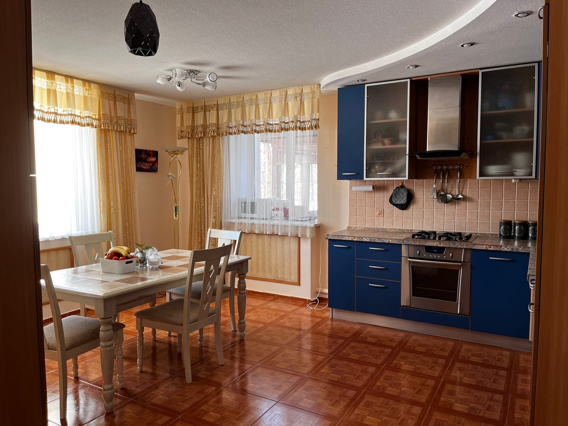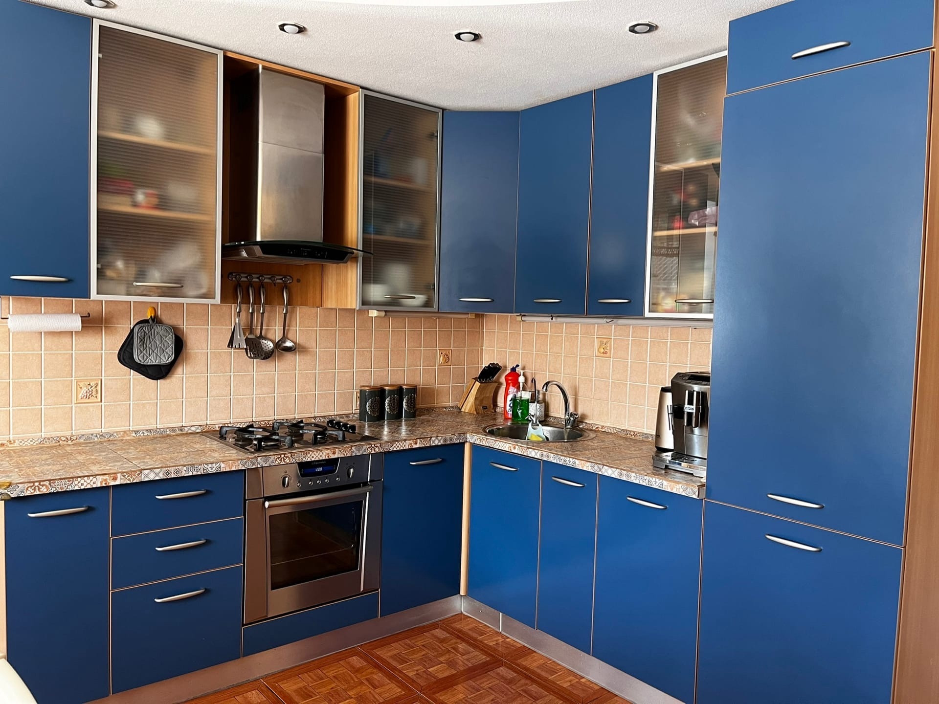Остается кухня со встроенной техникой (плита газовая, духовой шкаф, посудомоечная машина, холодильник).