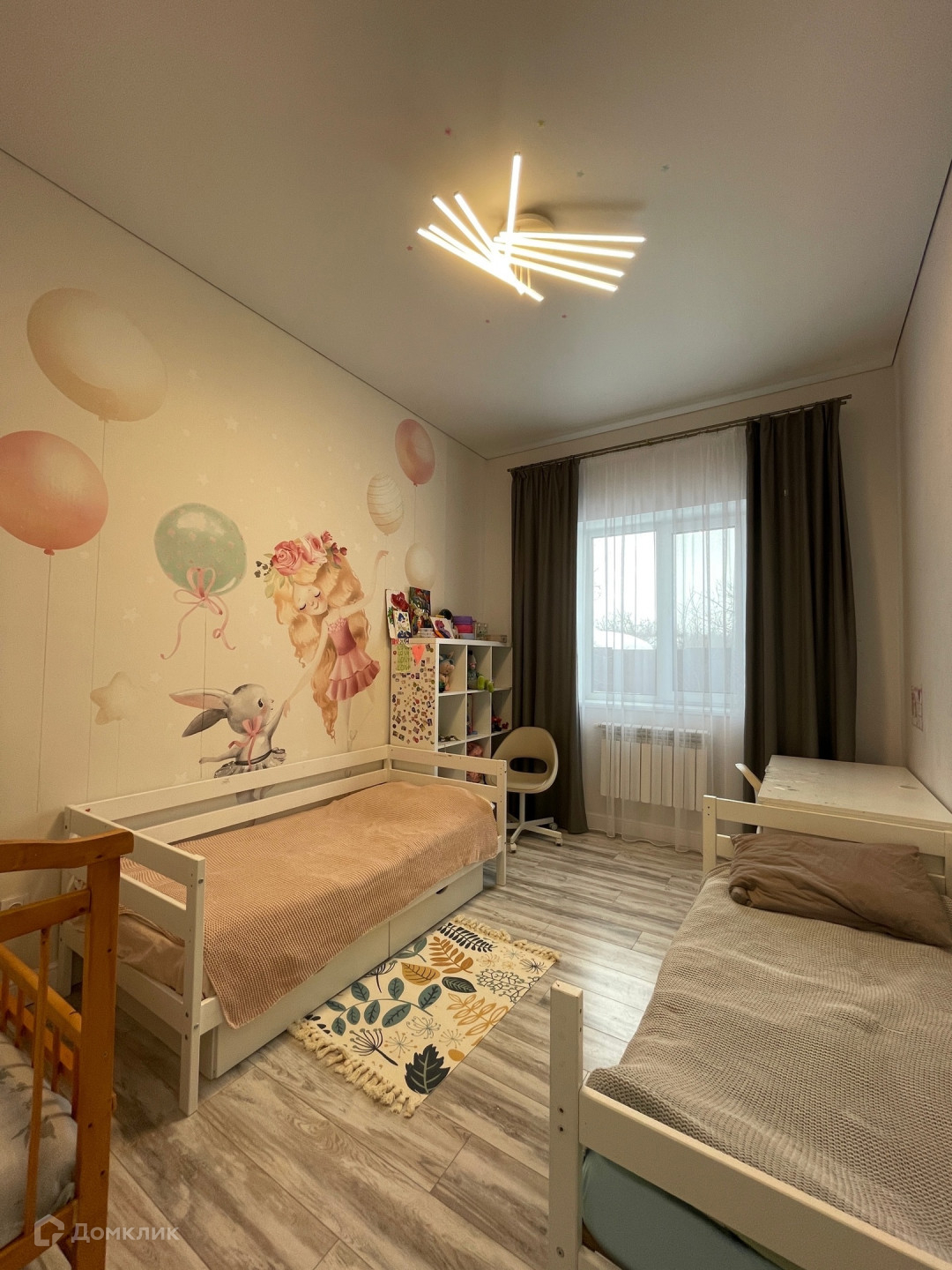 В доме 3 жилые комнаты, гостиная – кухня, 2 санузла, гардеробная.