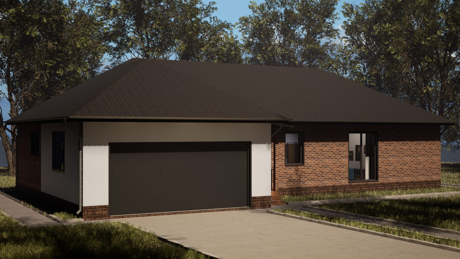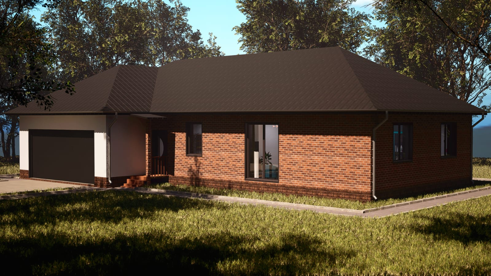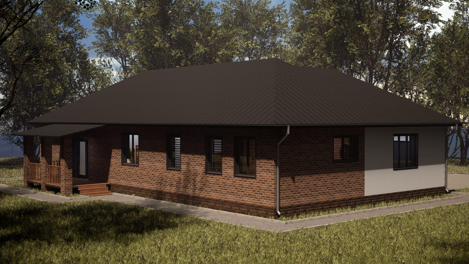 Материал стен - газобетон с облицовочным кирпичом фасада(баварский флеш медиум). Крыша - маталлочерепица, окна пластиковые.