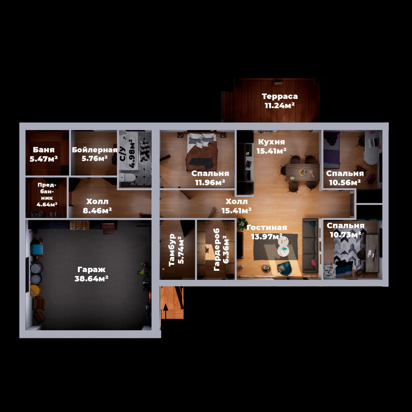В доме 2 санузла, 3 большие изолированные спальни, просторная и уютная гостиная и кухня. Общая площадь вместе с гаражом- 180 кв. метров.