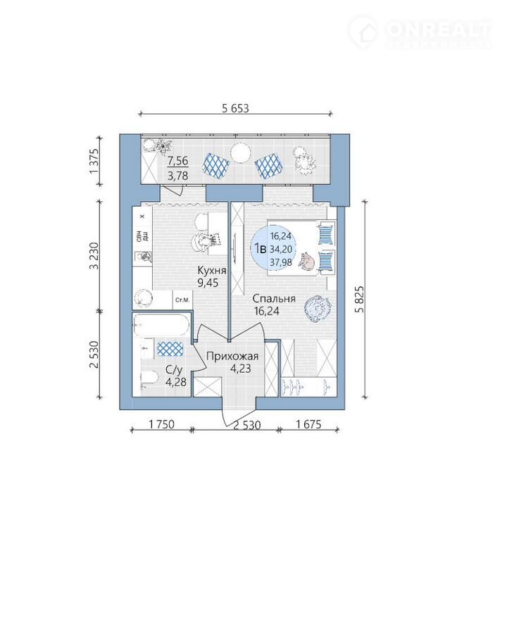 — oбщая площадь квартиры — 37,98 кв.м.,
