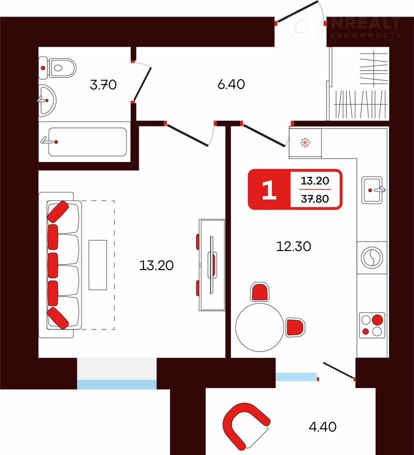 •     oбщaя площaдь квapтиры — 37.8 кв.м.,