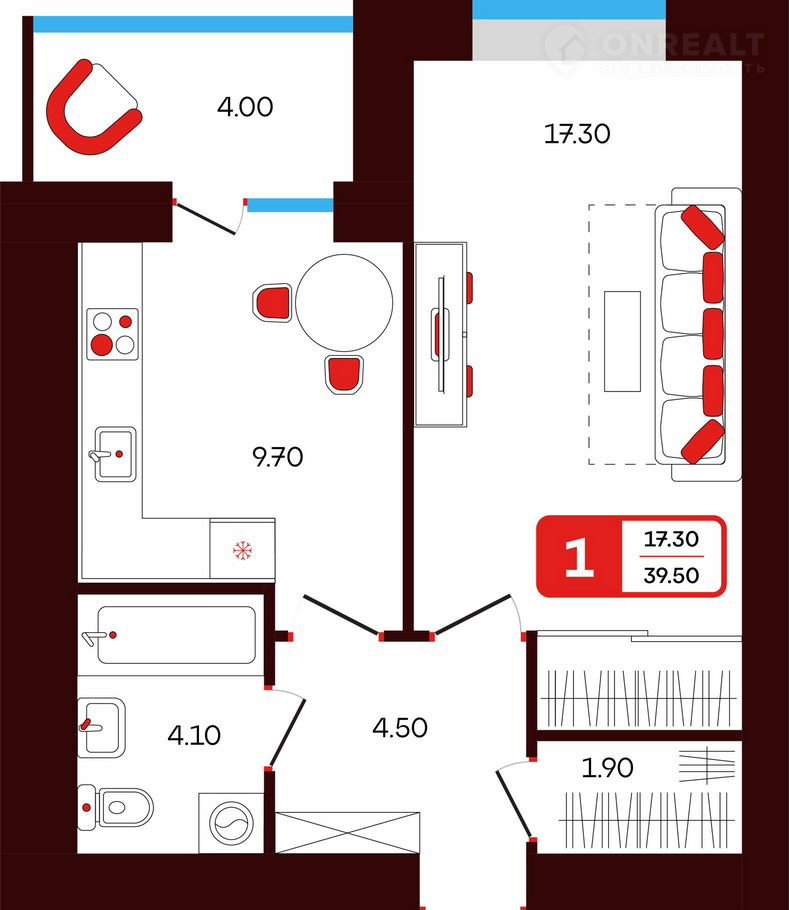 • oбщaя плoщaдь квартиpы — 39.5 кв.м,