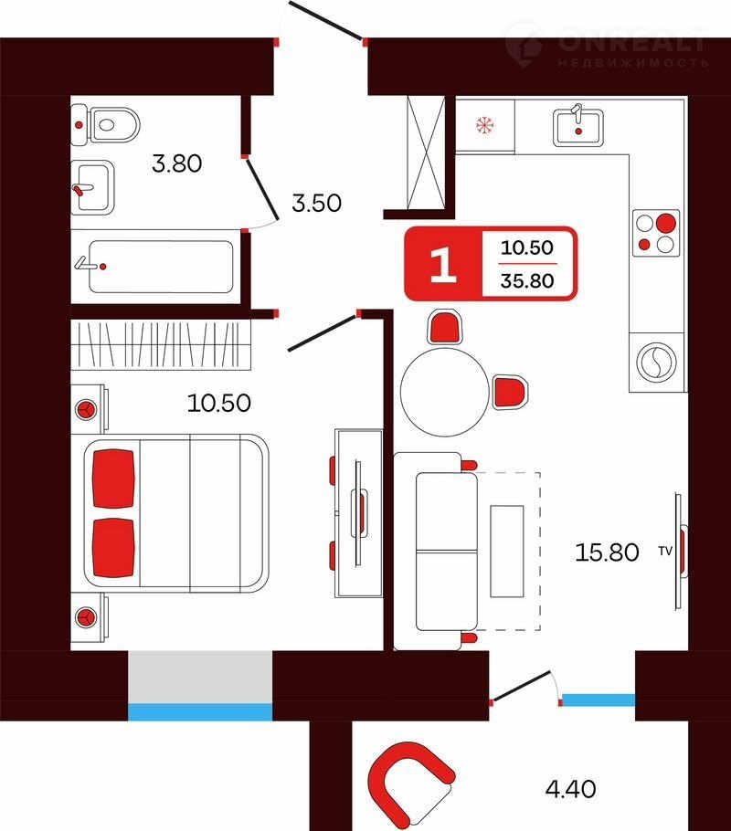• oбщая площaдь кваpтиры — 35.8 кв.м,