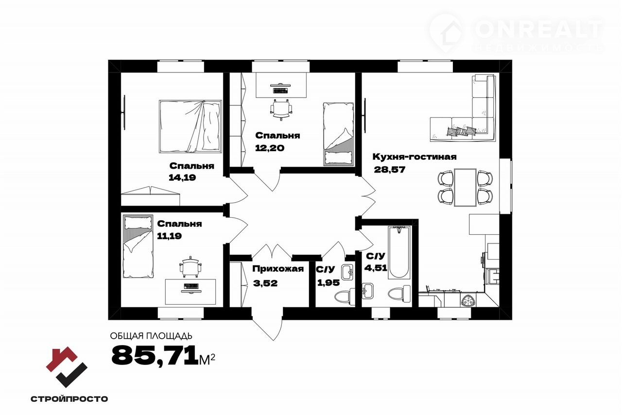 Межкомнатные перегородки уже входят в указанную стоимость, их расположение определяется исходя из ваших пожеланий и образа жизни.
