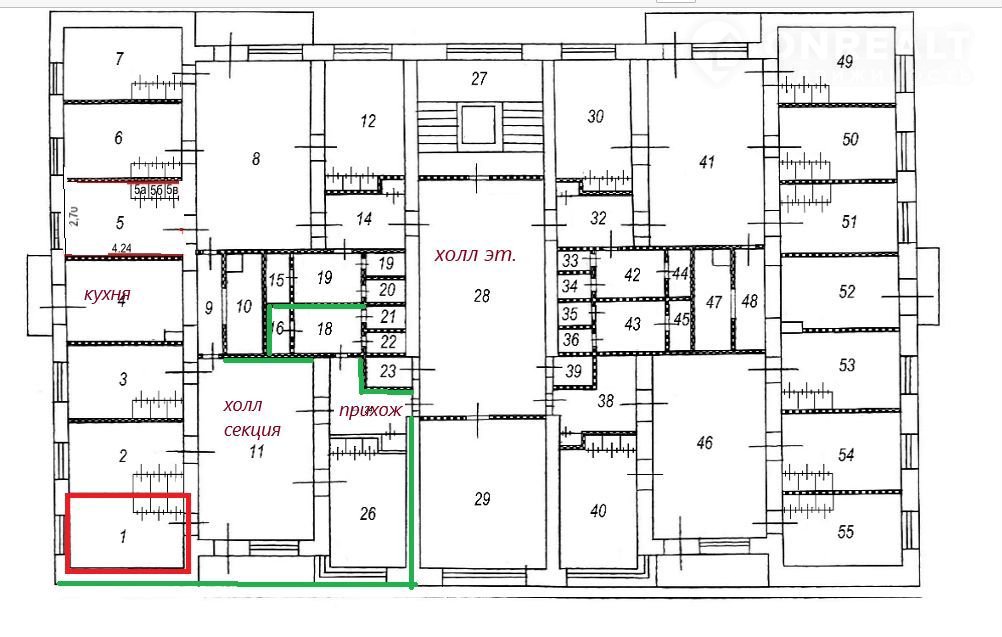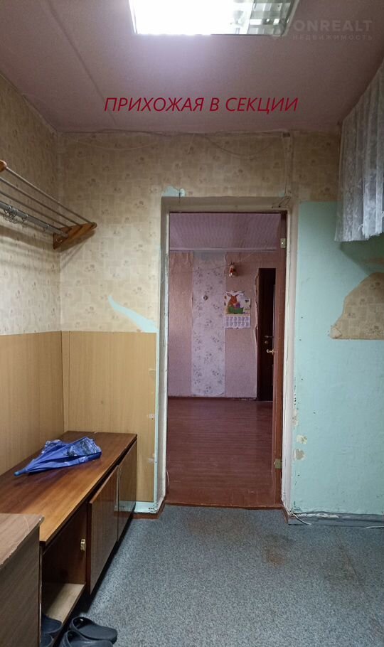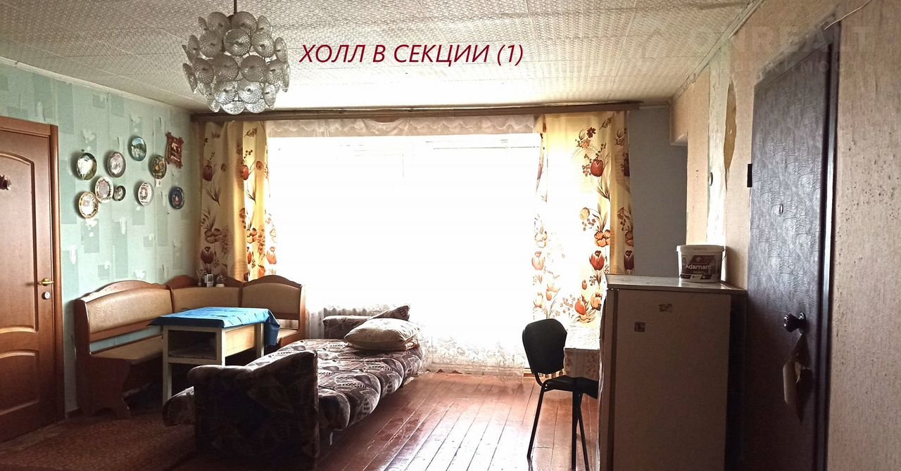 Общежитие секционного типа. Секция на 4 квартиры закрывается на ключ. И из прихожей Вы попадаете в уютное фойе с балконом. Из 4-х комнат проживают только в одной - приличный мужчина, который постоянно на работе. Небольшой коридор соединяет со 2-й секцией, в которой также проживают только в одной комнате - пожилая, доброжелательная женщина.