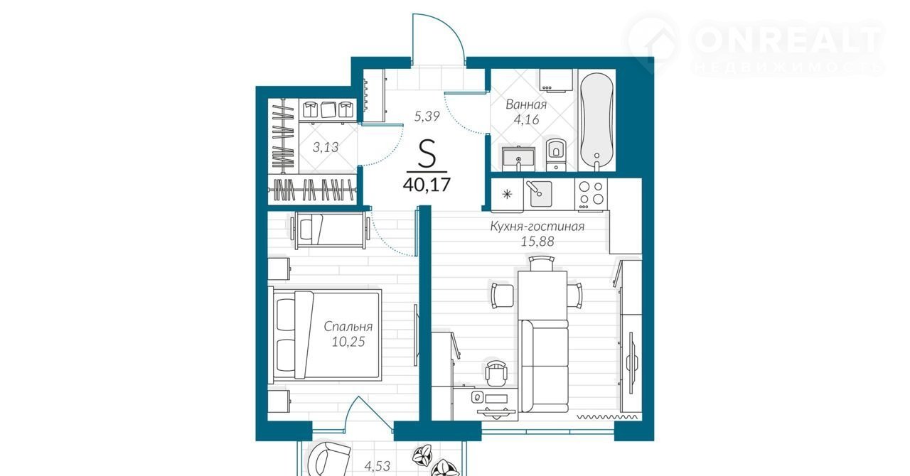 Общая площадь 40.2 м2