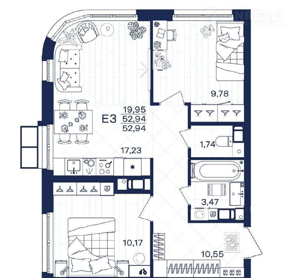 Общая площадь 52.9 м2