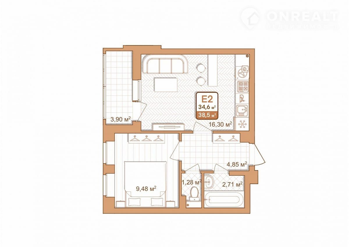 Общая площадь 38.5 м2