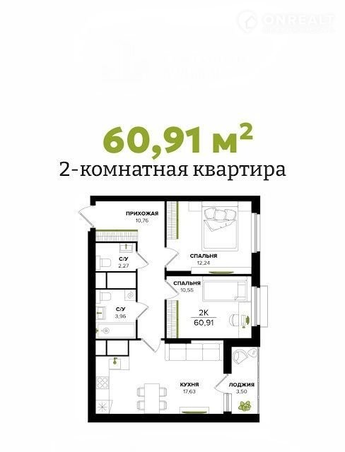 Общая площадь 60.9 м2