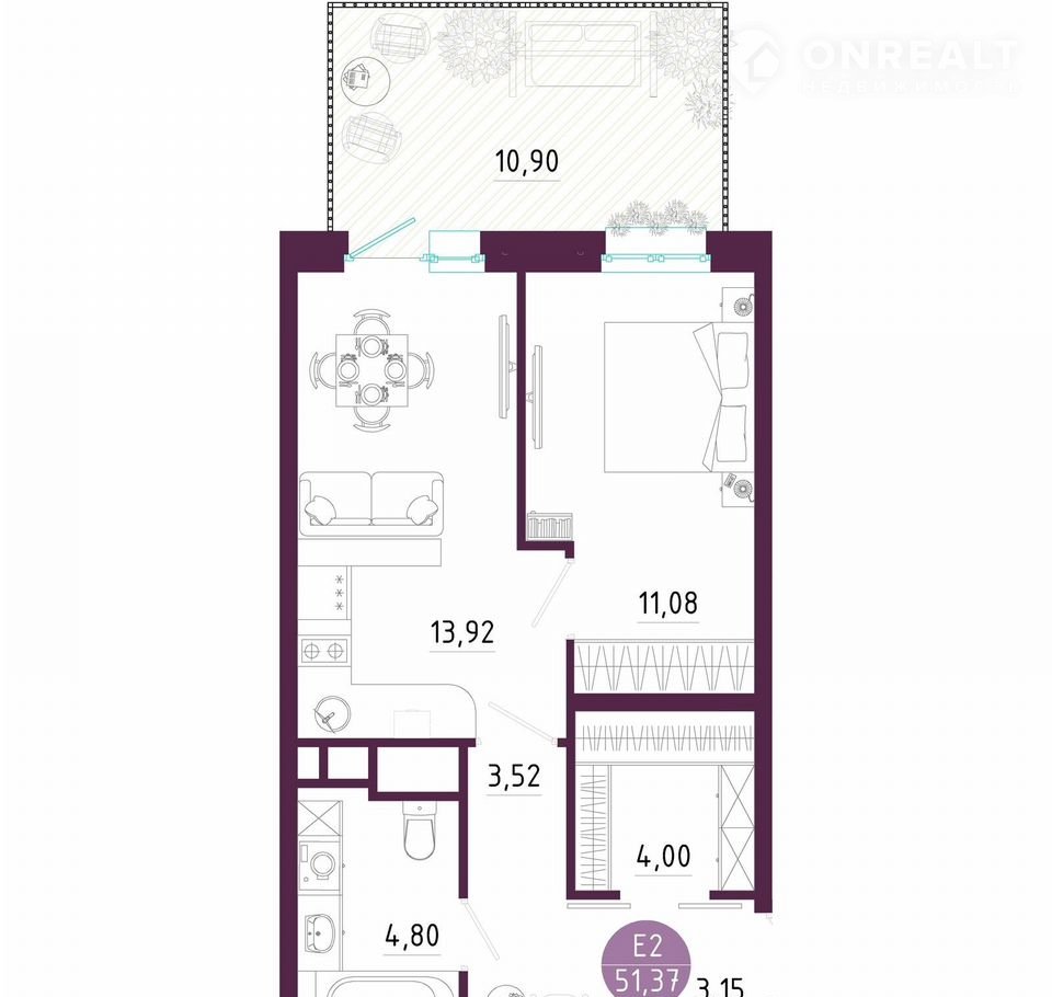Общая площадь 51.4 м2