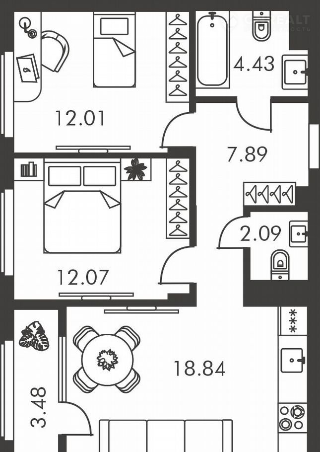 Общая площадь 58.5 м2