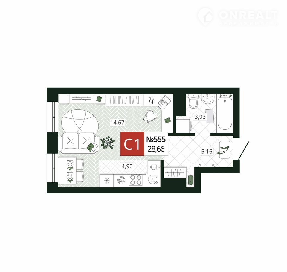 Квартира студия, 28.7 м2, этаж 13 / 19, на продажу в Туле