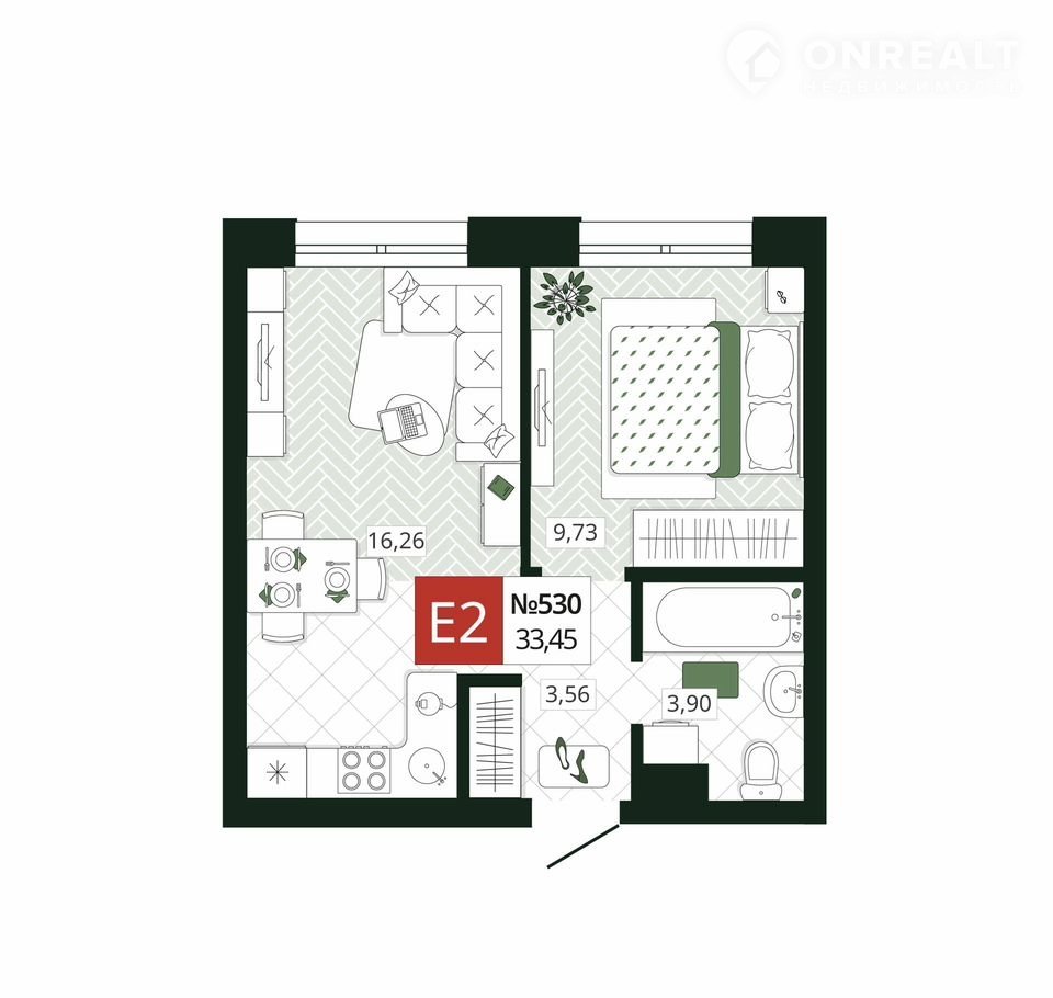 Общая площадь 33.5 м2