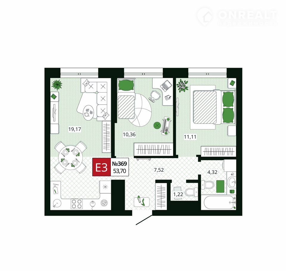 Общая площадь 53.7 м2