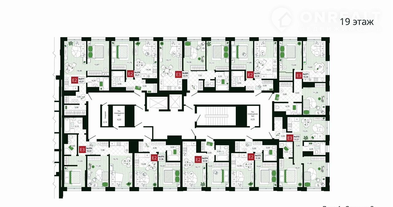 2-комнатная квартира, 51.6 м2, этаж 19 / 19, на продажу в Туле