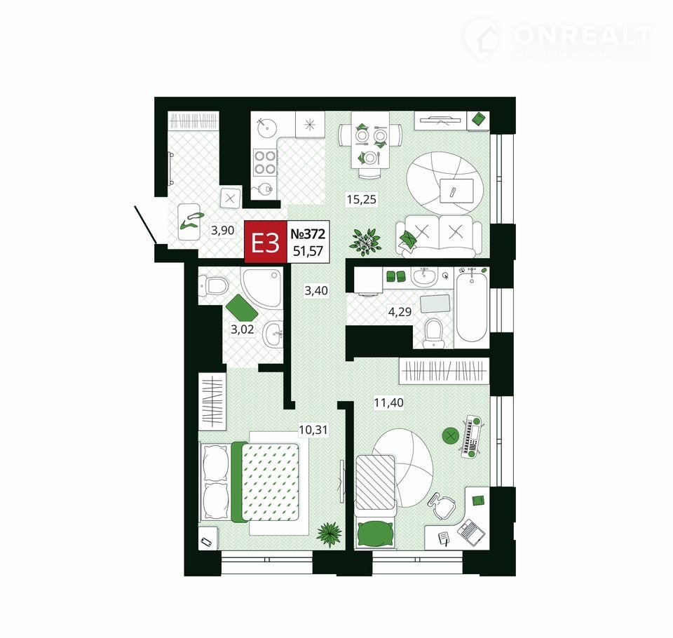 Общая площадь 51.6 м2